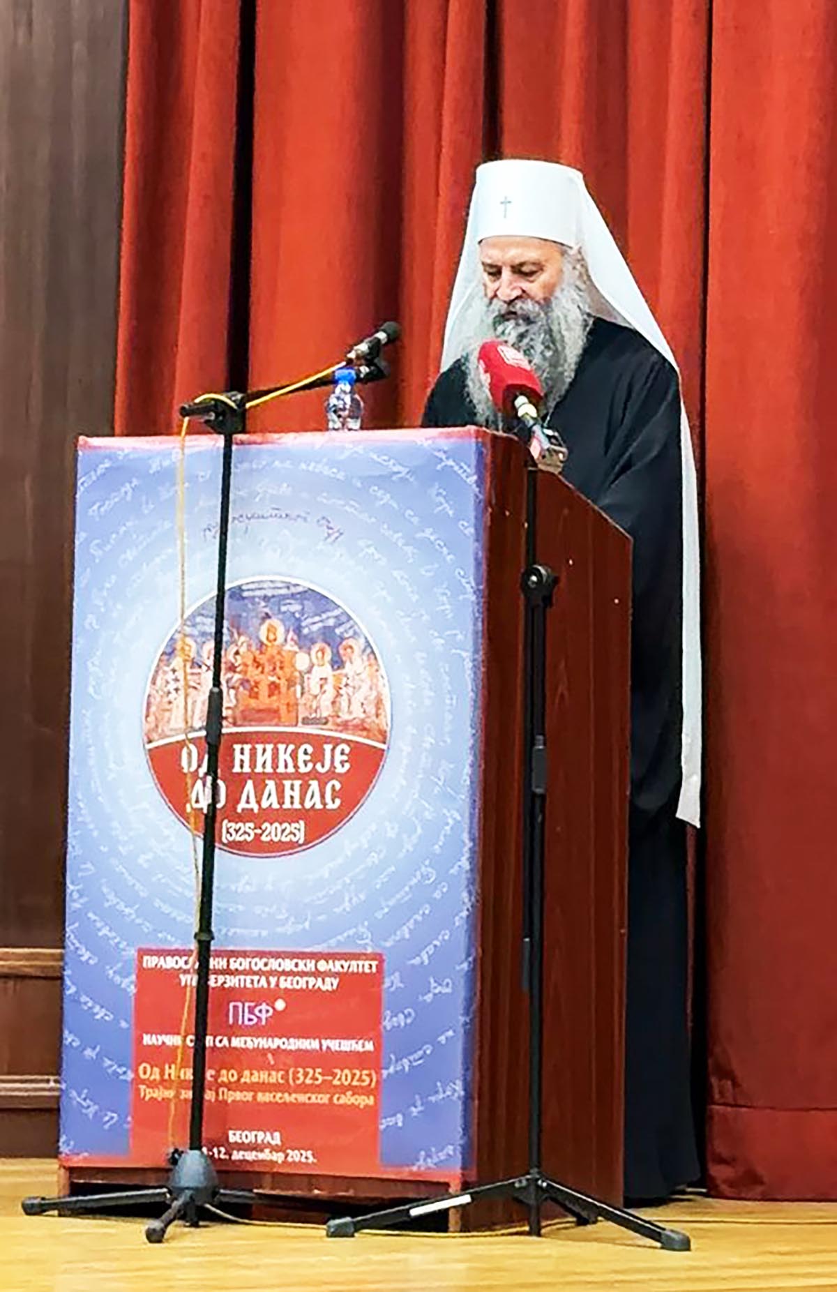 Његова Светост Патријарх српски г. Порфирије је отворио 11. децембра 2025. године на Православном богословском факултету у Београду дводневни међународни научни скуп „Од Никеје до данас (325–2025): Трајни значај Првог васељенског сабора“.