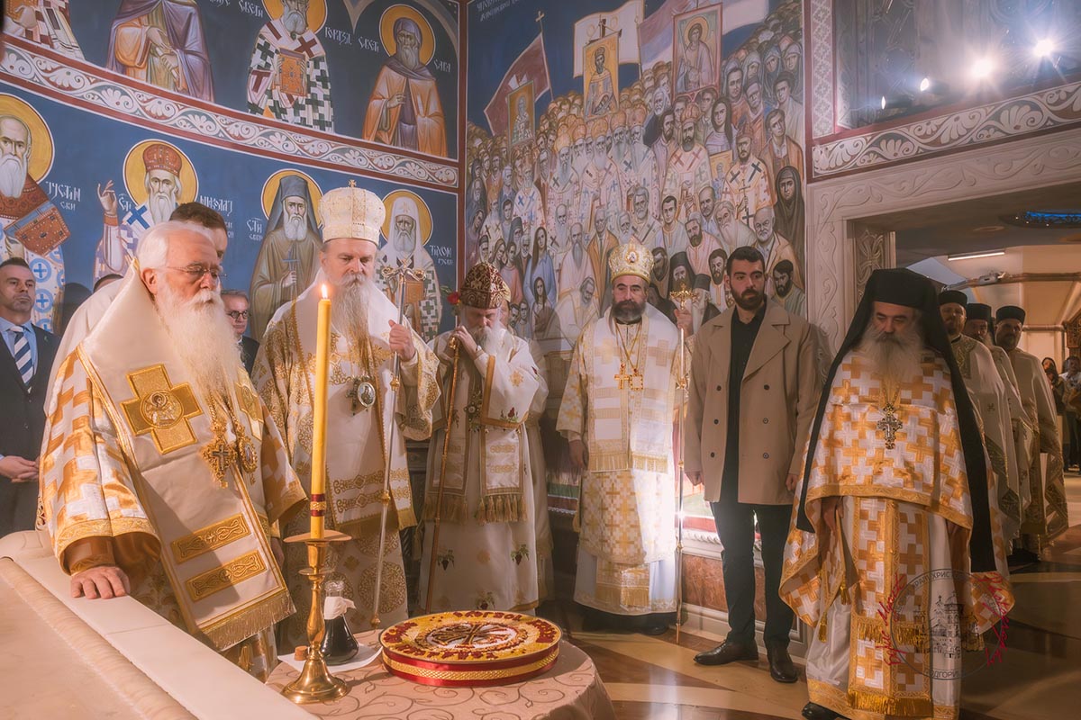 Зато посебно благодаримо браћи Јелинима који су данас овдје дошли из Јерусалимске Патријаршије, наш драги брат у Христу Митрополит Макарије, ученик нашег блаженопочившег Митрополита и по први пут наш брат у Христу Владика Из Волоса Игњатије, који су са великом љубављу дошли, који се сјећају врлина и заслуга нашег Блаженопоћившега Митрополита, о чему смо имали пририку да чујемо и синоћ и данас много лијепих ријечи, много лијепих свједочанстава. Наш велики пјесник Васко Попа када је писао о Светом Сави, на једном мјесту каже, ,,Путује, а пут се за њим рађа.“ Куда је год ишао наш Блаженопочивши Митрополит, а обишао је цио свијет, свуда су се откривале заслуге његове и даље се откривају, и ти његови трагови свијетле, његова дјела свијетле и то је богатство за све нас Православне хришћане. Нека га Господ награди вијенцем славе, непролазне и вјечне небеске, и нека Господ услиши његове молитве које он пред престолом Божијим, приноси за све нас, а све вас драга браћо и сестре, који долазите у овај свети Храм и молите се за душу блаженопочившега Митрополита, нека Бог изобилно награди, и његов благослов нека почива и на вама, и на вашим домовима, и на вашим потомству. Амин Боже дај! На многа и блага љета!“