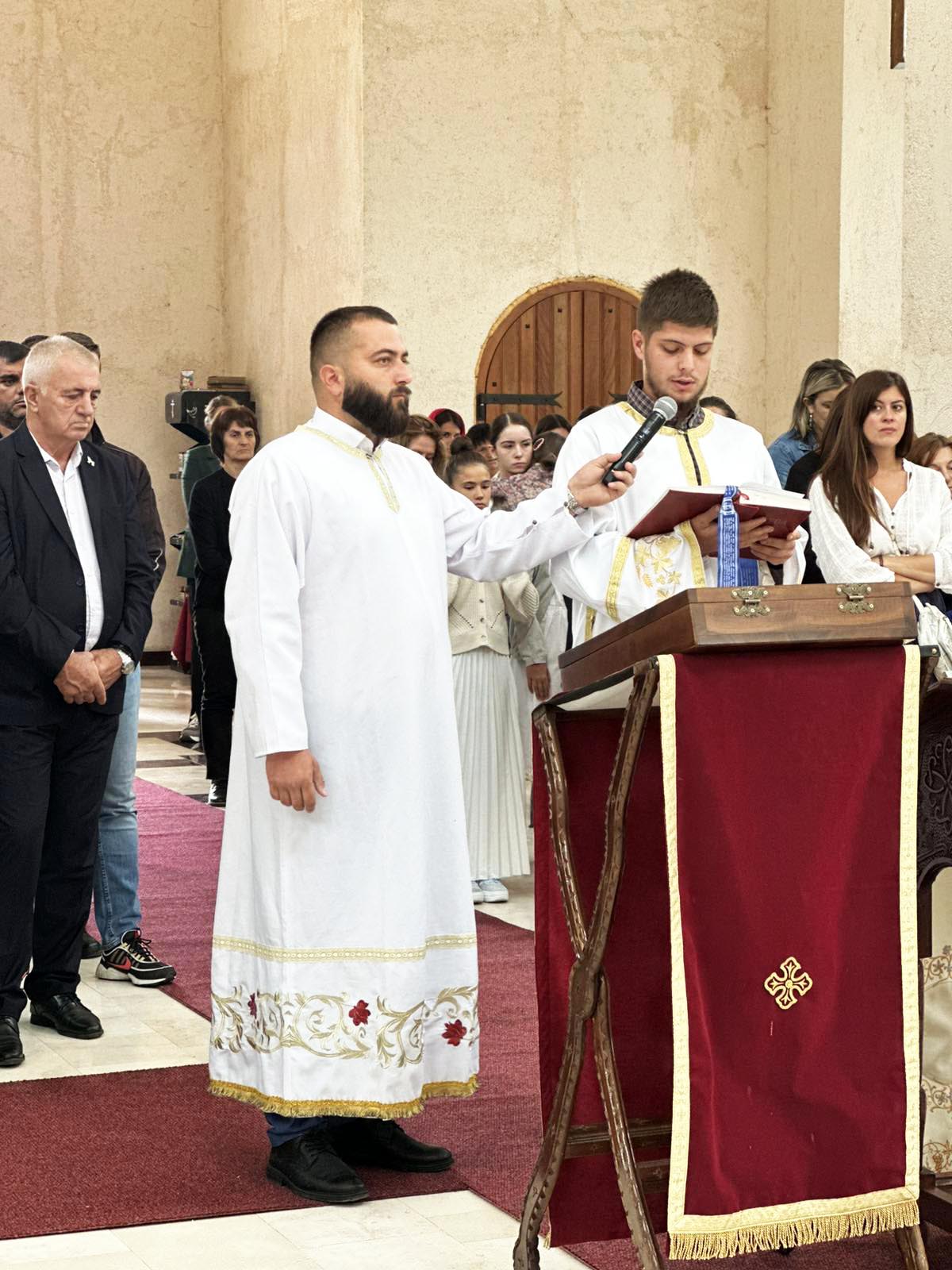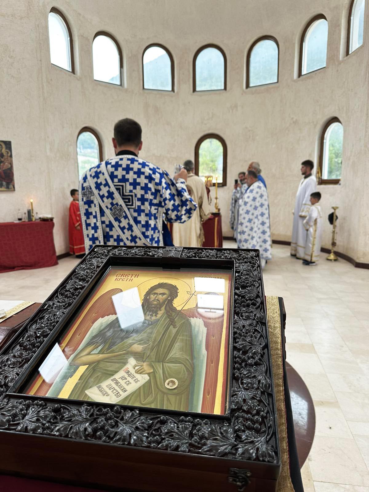 „Дошли су да покажу да нема граница, да их Свети Макарије и благодат Божја надилазе и наша љубав братска. Имамо још један догађај, јер нам је наш брат Драган Тадић са супругом Весном и ћерком Аном, који су имали велики губитак за који већина вас и зна, сина су изгубили и донијели су икону Светог Јована Крститеља у овај храм, да је поклоне и предају за храм на Смријечну, њихов братственички који им припада, иако они живе у Никшићу. Док се тај храм не обнови та ће икона бити овдје, а која је 12 дана била у кивоту Светог Василија и у коју је уграђен дио одежди Светог Василија са пресвлачења његових Светих моштију. То је диван примјер како једна породица све оно што задеси, а све што видимо у свијету, надајмо се, драга браћо и сестре, у вијеку; како на диван, кротак, хришћански смирен, ненаметљив, непретенциозан начин подноси и носи свој крст који им је Господ дао, тиме и показује и нама какви треба да будемо у најтежим тренуцима који нас налазе у нашем животу“.