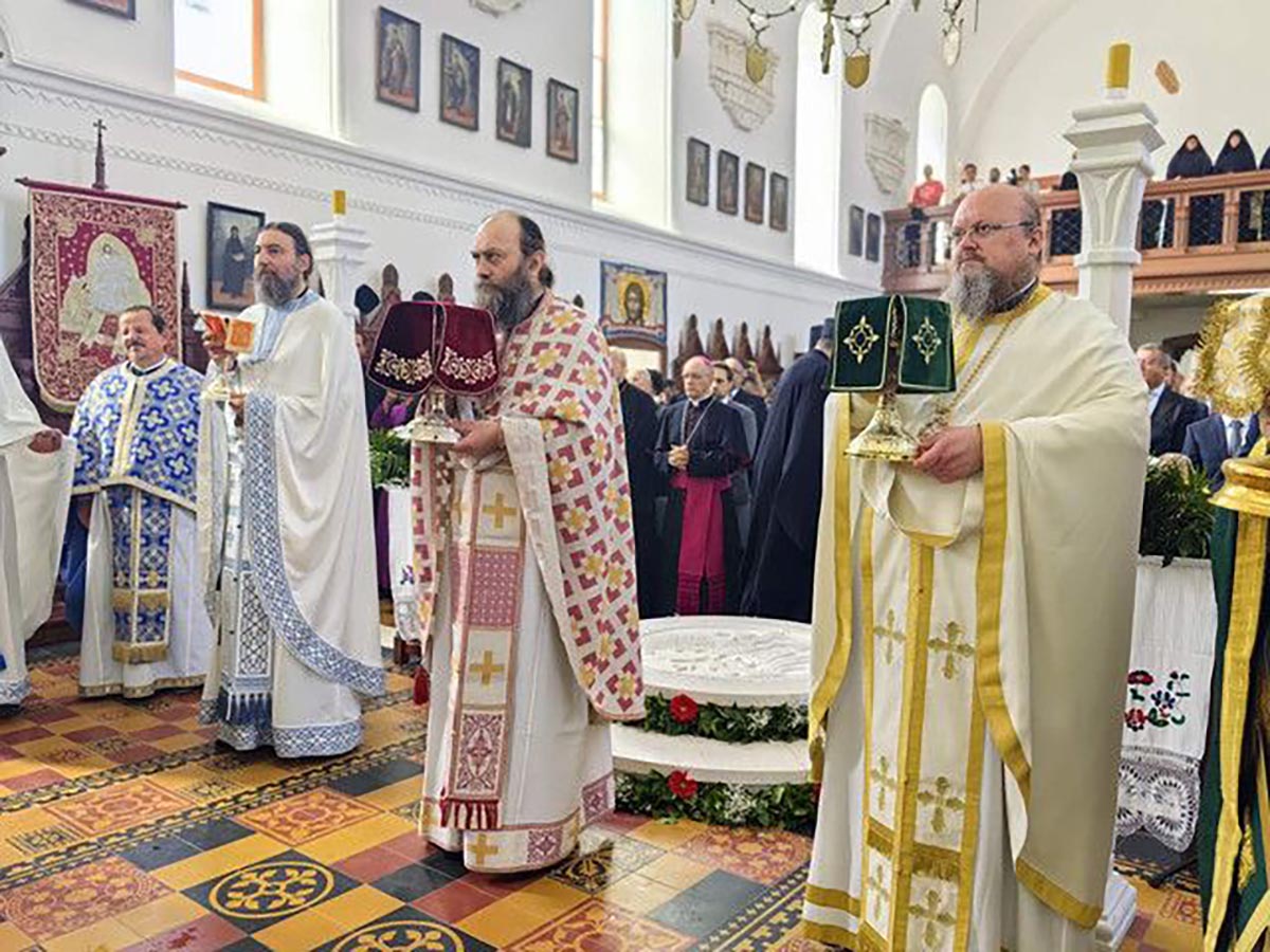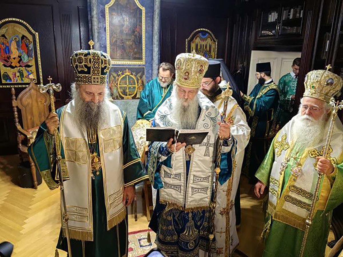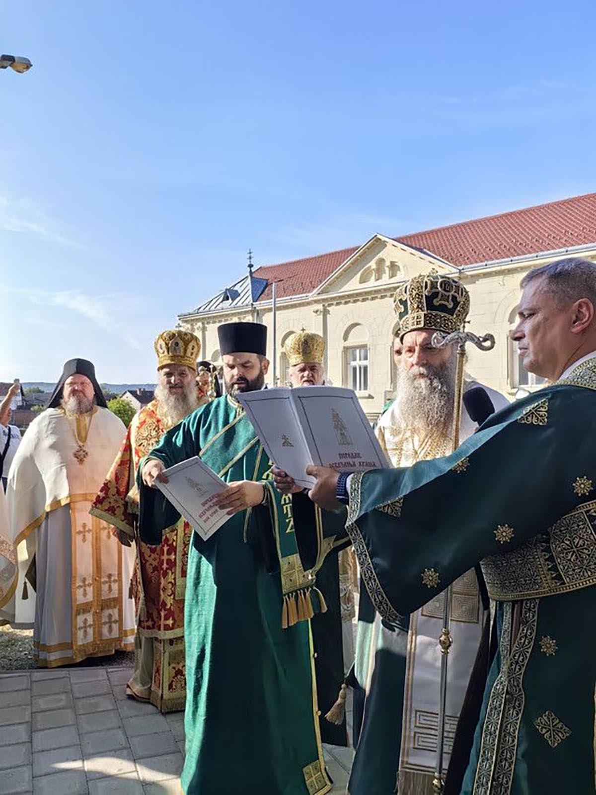 Његовој Светости су саслуживали: Архиепископ антидонски г. Нектарије из Јерусалимске Патријаршије; Митрополит димитријадски и алмирски г. Игнатије из Атинске Архиепископије; Архиепископ михаловско-кошицки г. Георгије из Православне Цркве Чешких земаља и Словачке; митрополити црногорско-приморски г. Јоаникије, немачки г. Григорије, рашко-призренски г. Теодосије, захумско-херцеговачки и стонско-приморски г. Димитрије, будимљанско-никшићки г. Методије; епископи вашингтонско-њујоршки и источноамерички г. Иринеј, пакрачки и славонски г. Јован, швајцарски г. Андреј, бихаћко-петровачки г. Сергије, буеносајрески и јужно-централноамерички и администратор загребачко-љубљански г. Кирило и викарни липљански г. Доситеј, као и многобројно свештеномонаштво, свештенство и ђаконство.