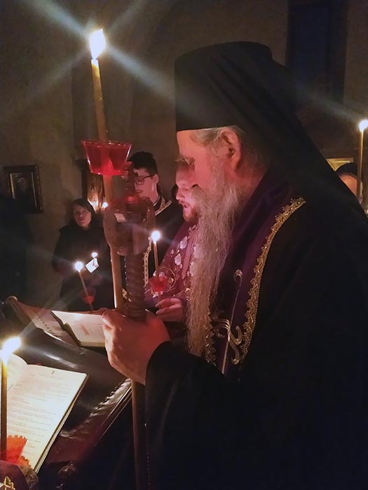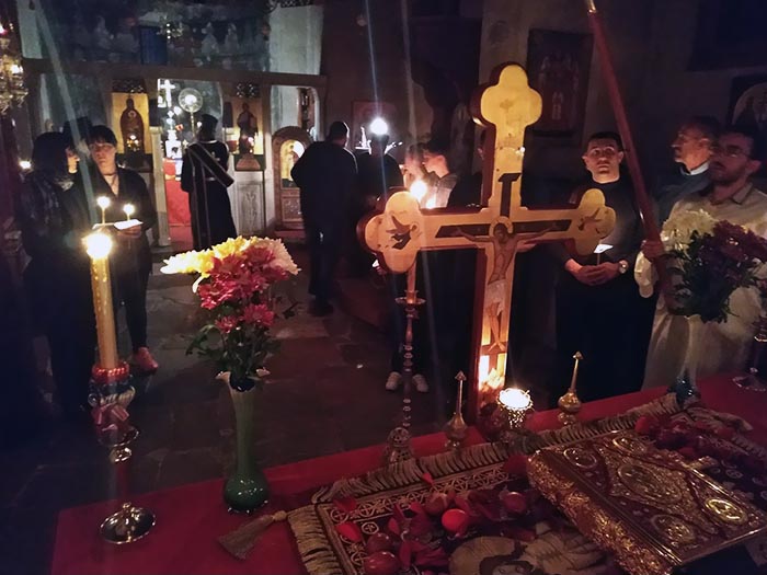 Његово Преосвештенство Епископ будимљанско-никшићки Г. Јоаникије служио је, на Велики петак, 26. априла 2019, у манастиру Ђурђеви Ступови, Вечерњу службу са изношењем плаштанице, платна које симболизује страдање Господа Исуса Христа.