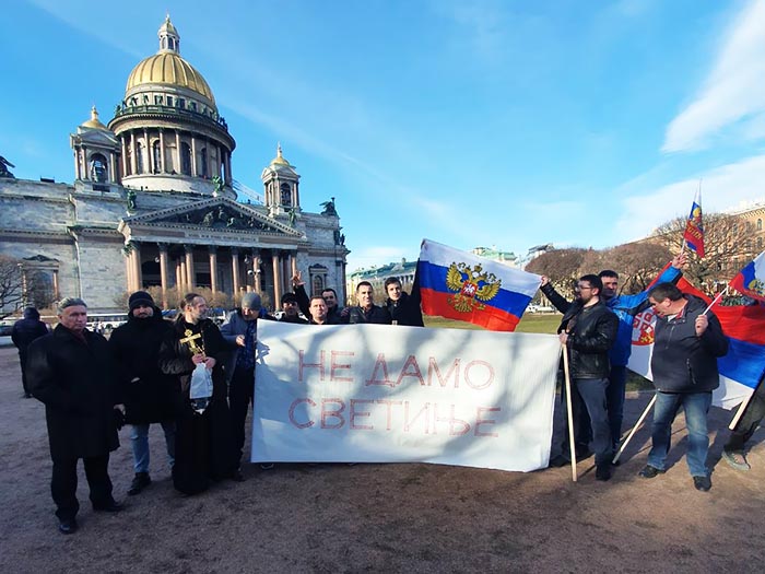 Уз благослов свештеника Руске православне цркве, који су такође присуствовали скупу у организацији Срба из Црне Горе: Николе Касалице, Саве Булића, Луке Радојевића, Марка Блечића, Миодрага Љујића, Вука Касалице и браће из Србије и Републике Српске, окупила се испред здања Исакијевског сабора да пружи пуну подршку свештенству МЦП и Епархије будимљанско-никшићке и вјерном народу у Црној Гори да истрају у одбрани светиња.