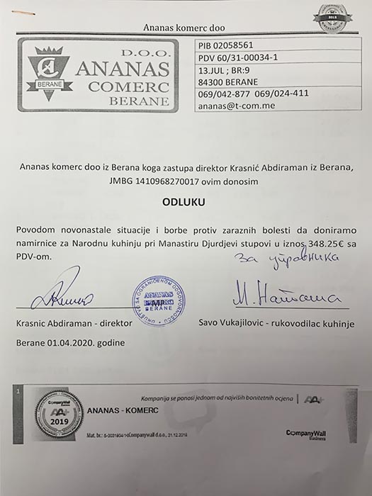 Управник Народне кухиње, јеромонах Сава Вукајловић захваљује се, у име управе Народне кухиње и у своје лично име, донаторима на овом хуманом гесту.