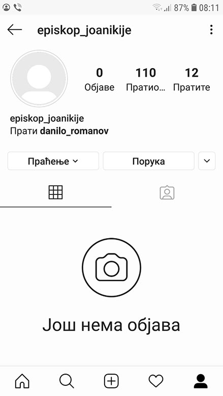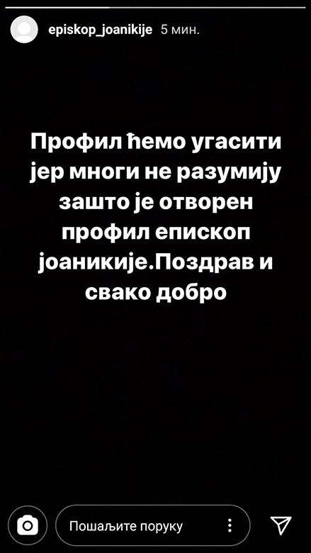 Сазнали смо да је на Инстаграму отворен лажни профил под именом Епископа будимљанско- никшићког Г. Јоаникија episkop_joanikije. Тим поводом обавјештавамо јавност да је све што се налази на тој адреси објављено без знања и благослова Епископа будимљанско-никшићког Г. Јоаникија.