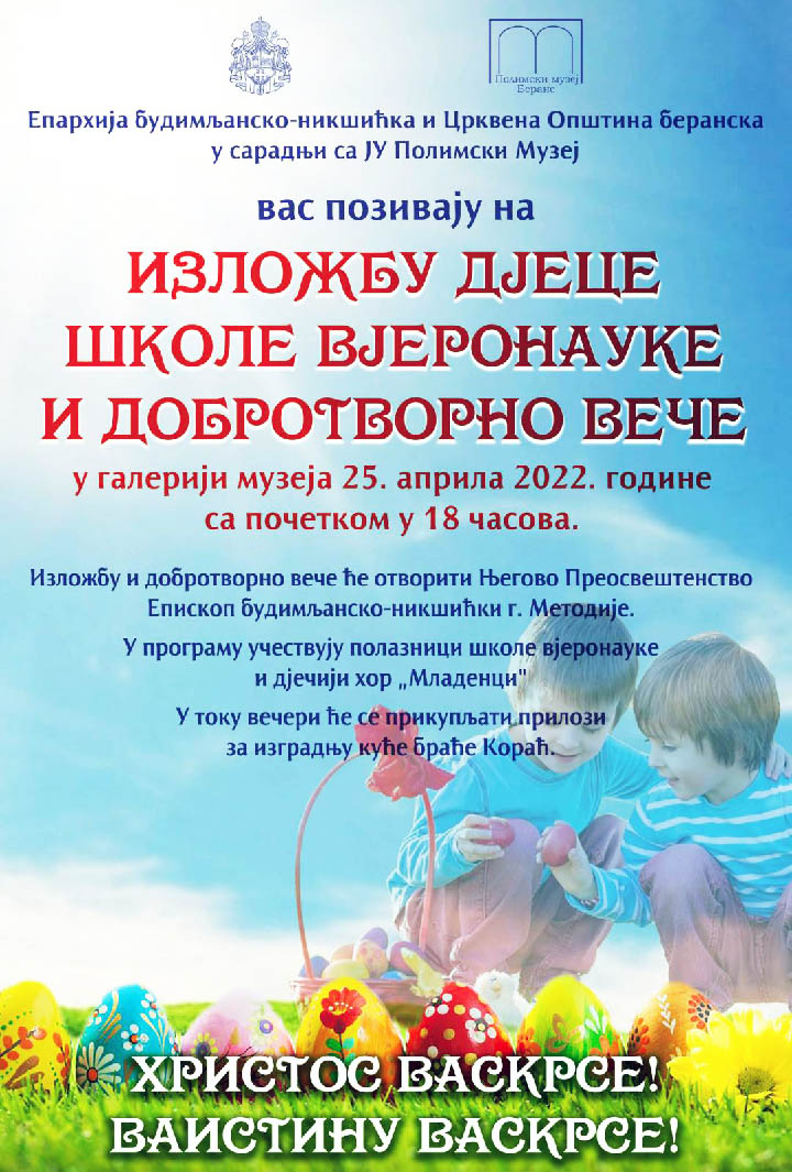 У сарадњи Епархије будимљанско-никшићке и Црквене Општине у Беранама са управом ЈУ Полимски Музеј, родила се идеја о организовању изложбе радова полазника школе вјеронауке на тему „Васкрс и заједница", која ће се одржати у галерији музеја на Васкрсни понедељак, 25. априла, са почетком у 18 часова. Истом приликом ће бити организовано и прикупљање прилога за изградњу куће породици Кораћ која расте без родитеља.