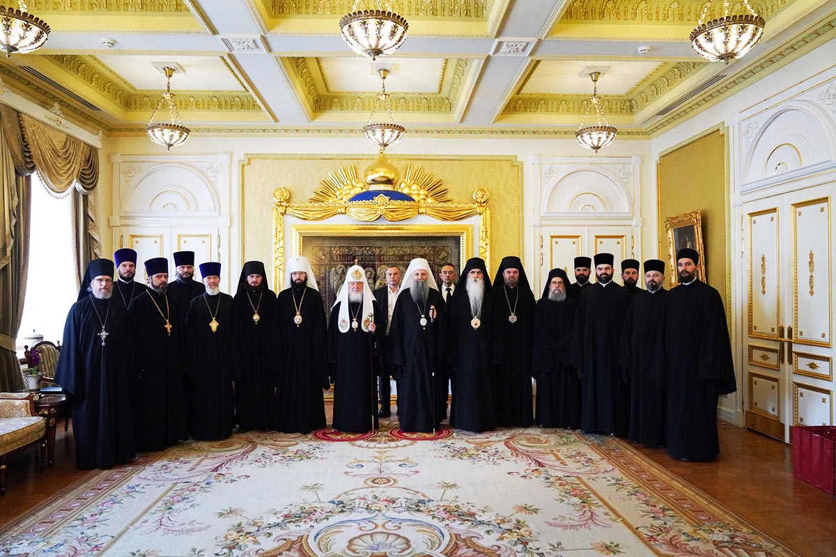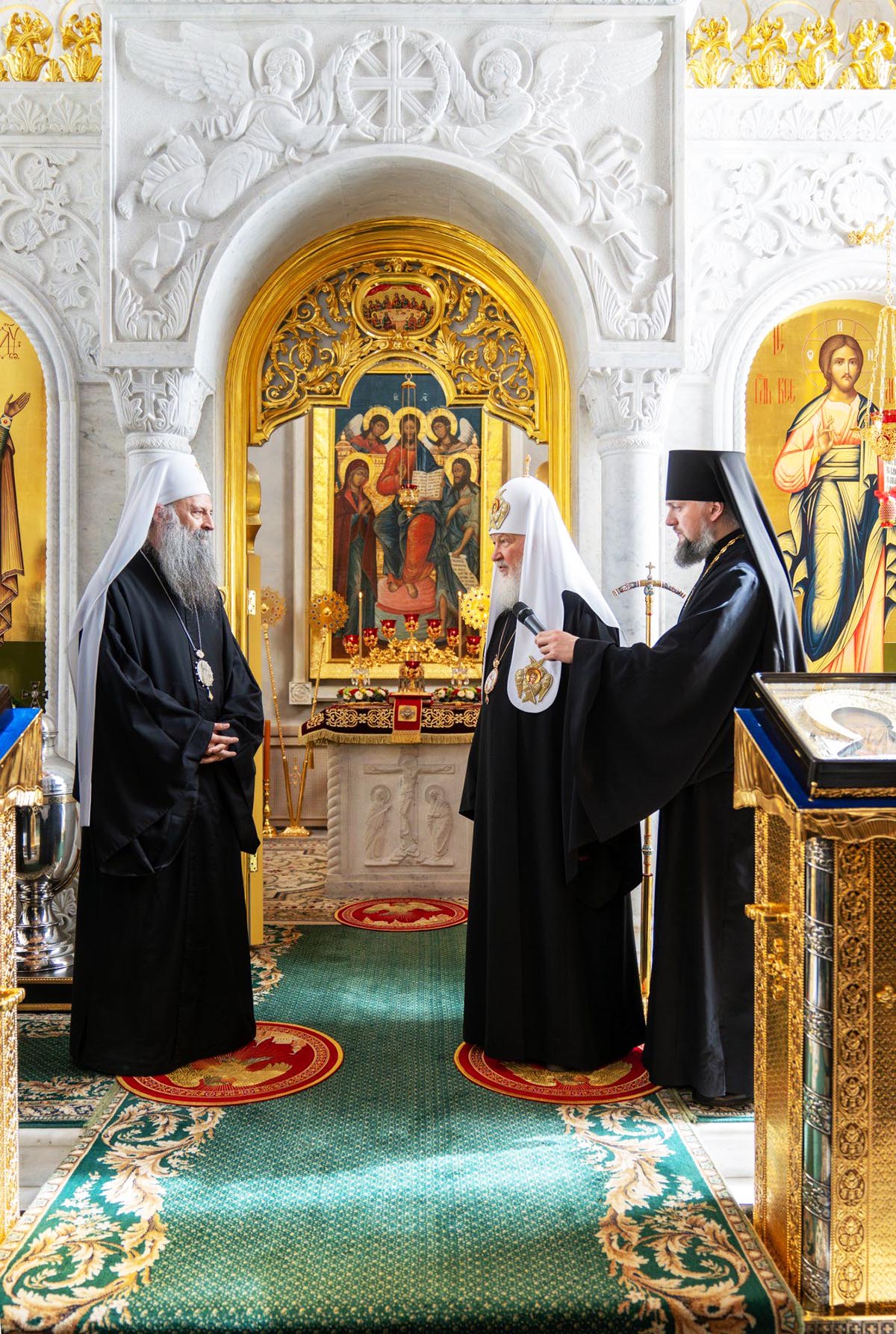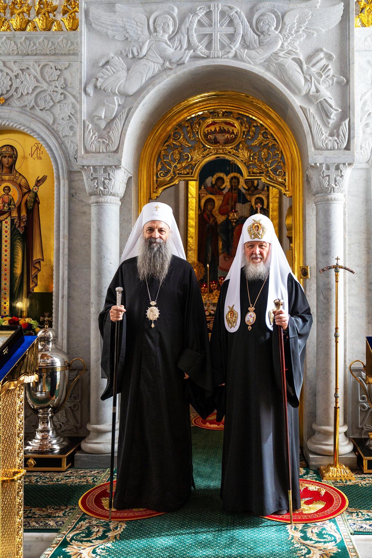 Његова Светост Патријарх српски г. Порфирије, који се са посланством Српске Православне Цркве налази у вишедневној посети Москви, разговарао је данас у Патријаршијској и Синодалној резиденцији у Даниловском манастиру са поглаваром Руске Православне Цркве, Светејшим Патријархом московским и све Русије г. Кирилом.
