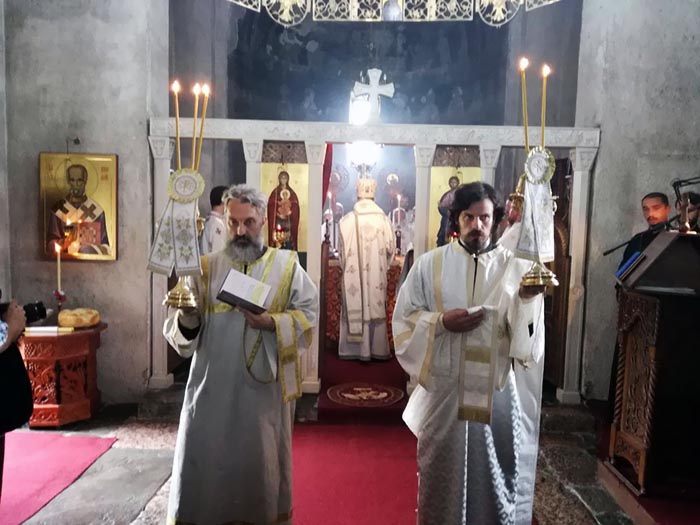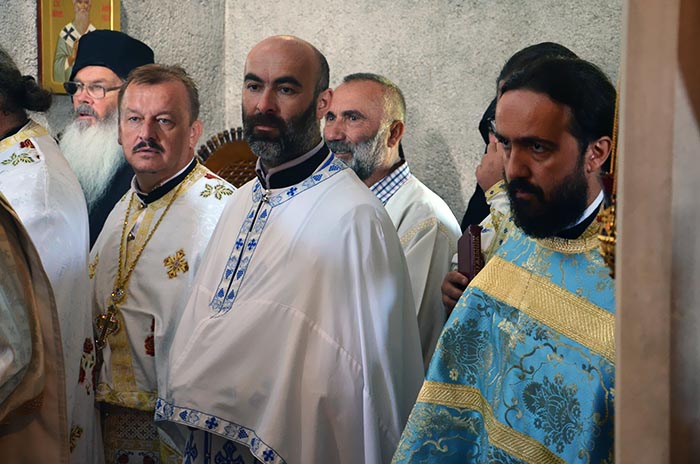 Епископу је саслуживало више свештеника и монаха са којима и бројни гостујући свештенослужитељи: протојереј-ставрофор Гојко Перовић, ректор Цетињске богословије, архимандрит Варнава (Дамјановић), игуман манастира Трескавца Епархије бихаћко-петровачке, Високопреподобни игуман Мардарије из манастира Поганова Епархије нишке, ђакон Никола Трифуновић из Цариградске патријаршије Руског егзархата.