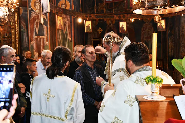 Након Литургије, Владика је предводио славску литију око храма, а онда је са свештенством благосиљао славски колач.