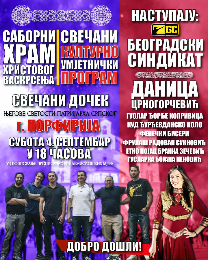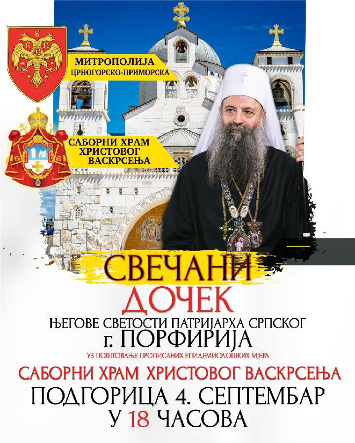 Поводом прве посјете Патријарха српског г. Порфирија Митрополији црногорско-приморској због устоличења Високопреосвећеног Митрополита црногорско-приморског г. Јоаникија, а која несумњиво представља велику радост и благослов за све вјернике у Црној Гори, обавјештавамо и позивамо сав народ који жели да лично дочека Патријарха Порфирија и прими његов патријарашки благослов, да узме учешћа у свечаности која ће се због тренутне епидемиолошке ситуације, одржати на отвореном испред Саборног храма Христовог Васкрсења у Подгорици, у суботу 4. септембра са почетком у 18 часова.