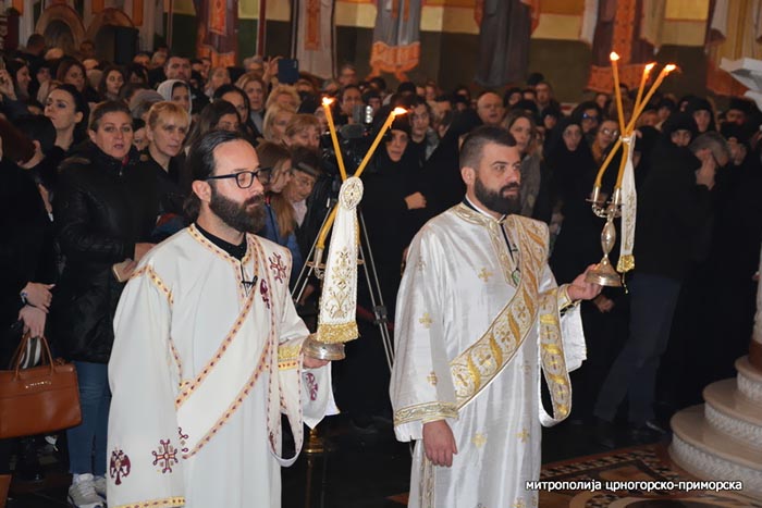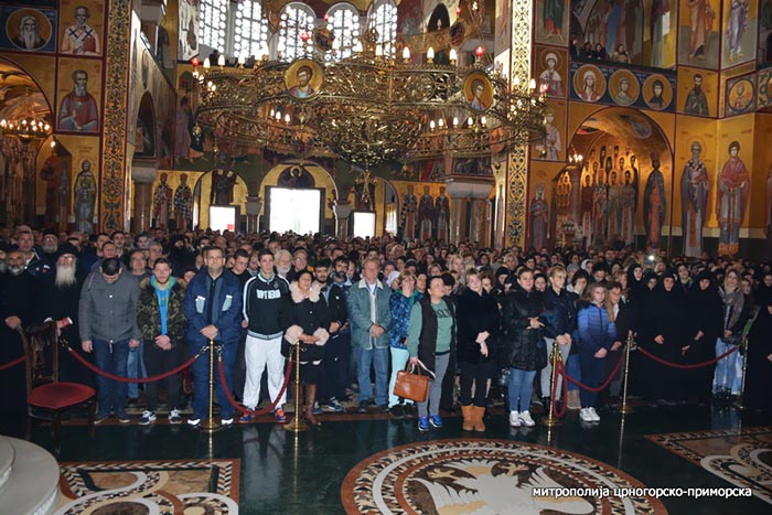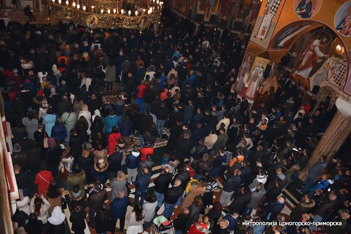 Након протестне Литије пред Скупштином Црне Горе Миреополит црногорско-приморски г. Амфилохије са Епископима будимљанско-никшићким г. Јоаникијем и диоклијским г. Методијем и свештенством Служио је Свету службу Божију у подгоричком саборном храму Христовог Васкрсења.