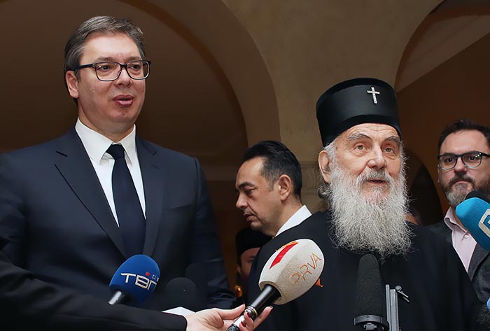 После састанка Његова Светост Патријарх и Председник су се обратили многобројним представницима медија. Преносимо извештај агенције Танјуг: