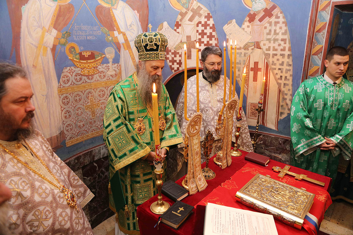 – У име Оца и Сина и Светог Духа. Ваше Краљевско Височанство, браћо архијереји, часни муфтијо, бискупе Евангеличке Цркве, браћо и сестре, радост и благослов је данас велики што смо се сабрали овде у дому Карађорђевића, у Краљевском дому, да прославимо једног од апостола, да прославимо крсну славу дома Карађорђевића. Данас је дан посвећен Светом апостолу Андреју Првозваном. И поред тога што је то велики благослов за све нас, а посебно благослов за овај дом, слава дома Карађорђевића на неки начин открива и призвање Краљевске породице, открива њен крстоносно-васкрсни пут. Свети апостол Андреј је први кога је Господ позвао да иде за Њим и да узме крст свој и сведочи истину о Царству Небеском, истину о Христу као Спаситељу. Свети Андреј је и први који се одазвао, а онда заједно са њим и првоврховни апостол Петар, његов рођени брат, а затим и остали апостоли. Они су пошли су за Христом сведочећи тајну крста и тајну васкрсења, тајну Царства Небеског читавом свету, читавој васељени.