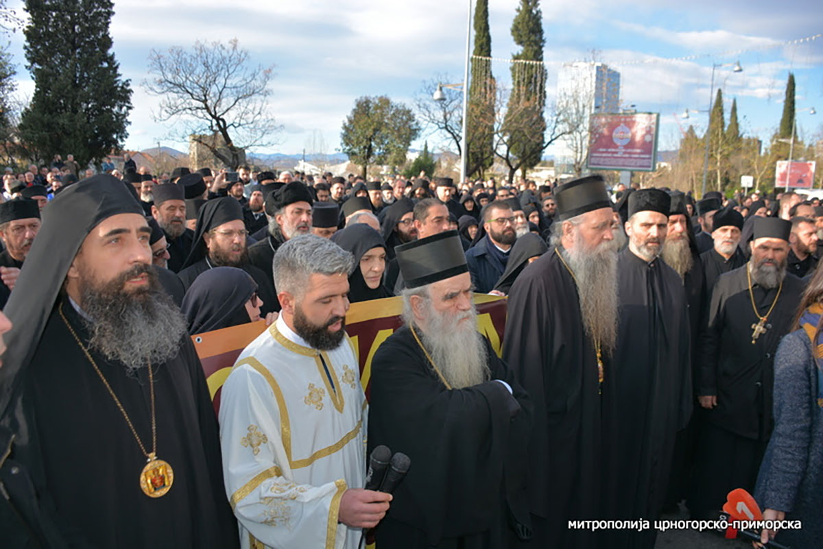 Господ није дошао, као што је сам рекао, у овај свијет и постао човјек на Божић од Пресвете Дјеве, да му служе, него да служи, и не само да служи, него и да живот свој жртвује за народ и људе своје. И непрекидно Он се жртвује за нас. И данас, ми смо примили Његову жртву – Његово Тијело и Његову крв – свједочанство Бога вјечне љубави. Тијело и Крв Господња, које примамо, освећује нас и учи, све људе, да се угледамо на Њега, не да тражимо да нам служе и да се клањају нама, него да и ми служимо на христолики начин, и да се цијеливамо са Господом, примајући Његово Тијело и Крв, Његову љубав и кроз Његову љубав да заволимо једни друге љубављу Божанском вјечном и и непролазном. То је оно чему служи ова Света литургија и чиме се надахњују и сви они који се крштавају у име Оца и Сина и Духа Светога. И ово наше данашње сабрање је сабрање да се научимо да служимо, а не да господаримо и владамо. И да научимо да се жртвујемо на начин на који се Христос жртвовао за човјечанство. Да се жртвујемо једни за друге, јер нема веће љубави од оне да неко живот свој положи за ближње своје. Та христолика жртва, та Божја истина и правда, она је која побјеђује у овом свијету, непрекидно вјековима. И данас побјеђује и у вјекове ће побјеђивати. Зато смо данас и носили ону поруку Светог Петра Цетињскога да је у имену Божјем суд и правда. У имену Божјем је побједа. И данас овдје не побјеђујемо ми некога другога, нити неко други нас. Него Бог, правда Божја, истина Божја, љубав Божја је она која нас призива да се ње причестимо, да сагласно њоме живимо и да се према њој управљамо на овој земљи.