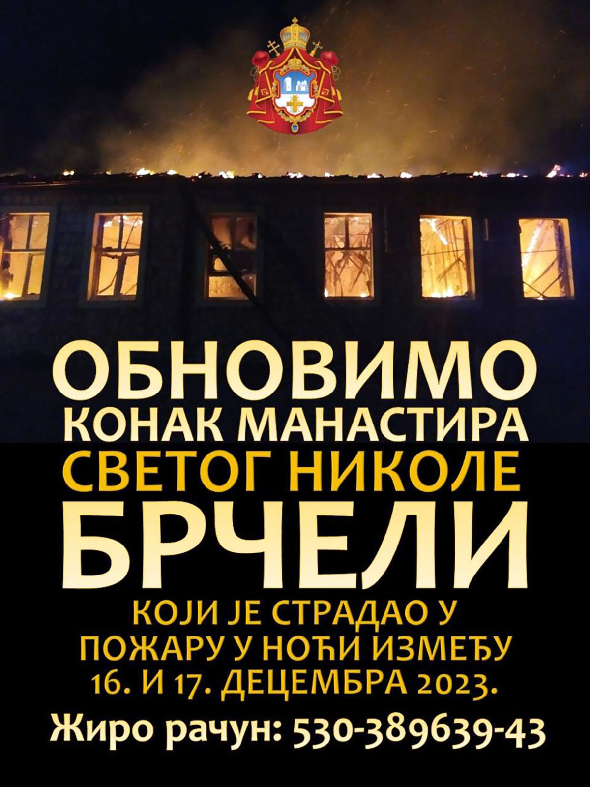 Митрополија црногорско-приморска и Манастир Светог Николе у Доњим Брчелима – Црмници позивају све људе добре воље да помогну обнову конака ове светиње, који је у суботу вече, 16. децембра, страдао у пожару.