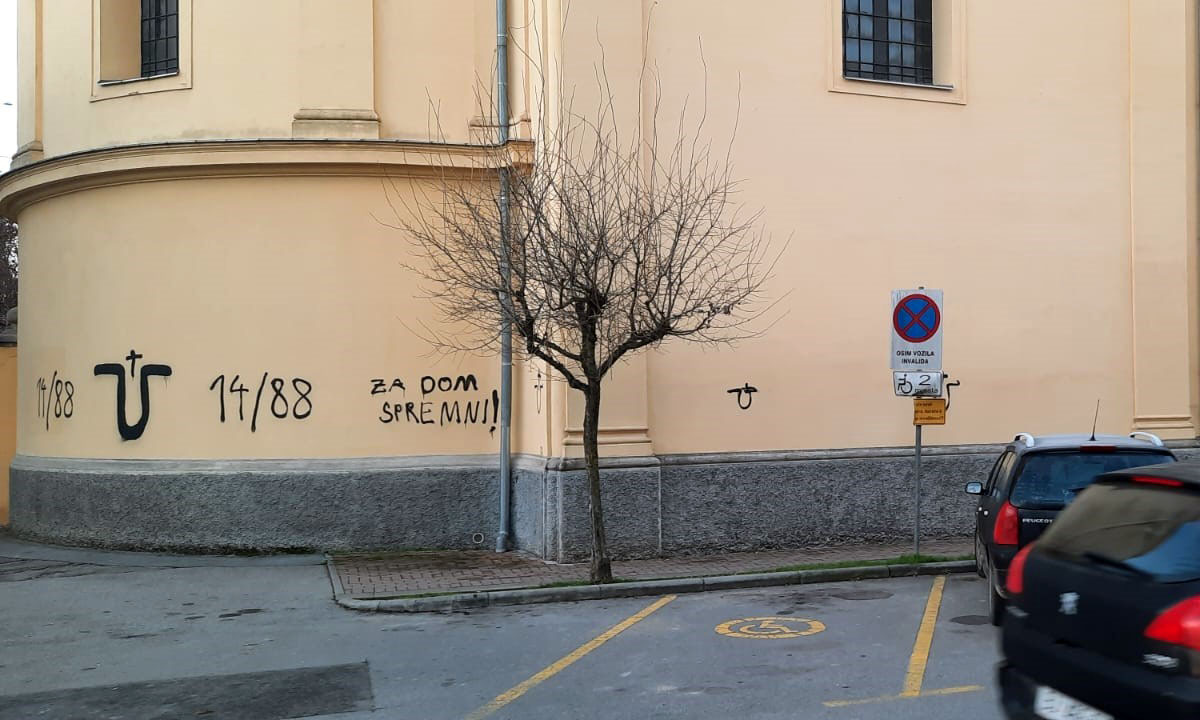 Недавно обновљени храм Свете Тројице у Бјеловару освануо је, у четвртак, 21. децембра, ишаран графитима са усташком и неонацистичком симболиком. Поред натписа ”За дом спремни” и усташког симбола ”У”, на прочељу цркве исписана је и нумеричка ознака 14/88. Број 14 представља слоган од четрнаест ријечи на енглеском језику: ”“We must secure the existence of our people and a future for white children“ („Морамо осигурати будућност наших људи и будућност за бијелу дјецу”), Дејвида Лејна, припадника неонацистичке организације The Order, док број 88 означава нацистички поздрав ”Heil Hitler”, тако што се слово „H“ налази на осмом мјесту енглеске абецеде.