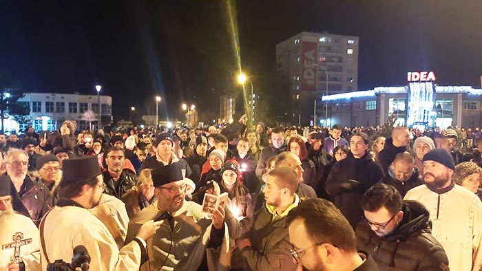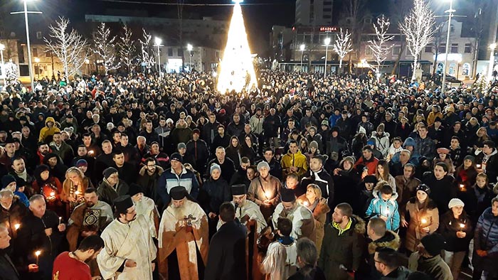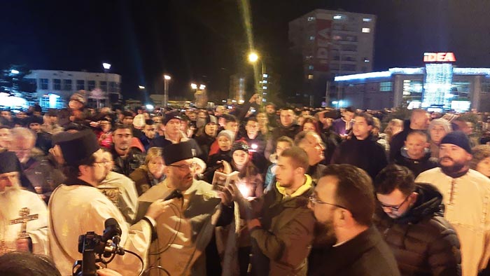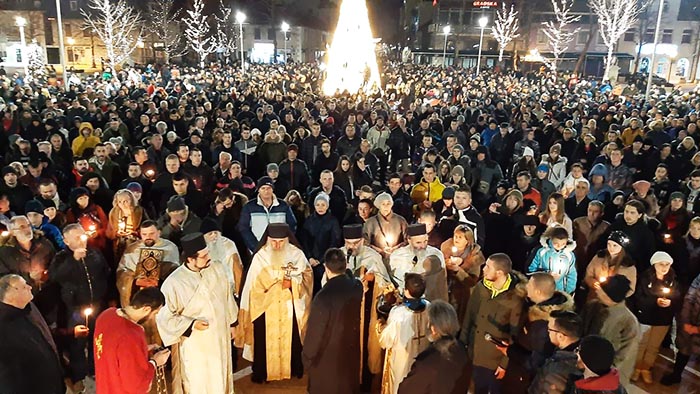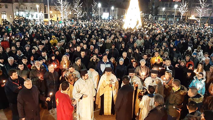 На Тргу „Слободе“, ријечима надахнуте пастирске бесједе, обратио се свештеник Миодраг Тодоровић. Он је казао да је овај вечерашњи свештени ход кренуо из Божјег храма и завршиће се у њему, те поручио да сваки пут који не води у храм одлази у ћорсокак.