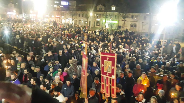 „Никшић пише своју најљепшу биографију од свог постојања. И овим сабрањем вечерашњим смо показали да смо изнад свих подјела и да смо се окупили само са једним циљем – да не дамо светиње. Вечерас имамо велики благослов да су са нама наши Архијереји Владика Јоаникије, наш надлежни Епископ и Владика Теодосије са страдалног Косова и Метохије, са монаштвом из Дечана, царског Призрена, Бањске, Зочишта“, навео је свештеник Јокић.