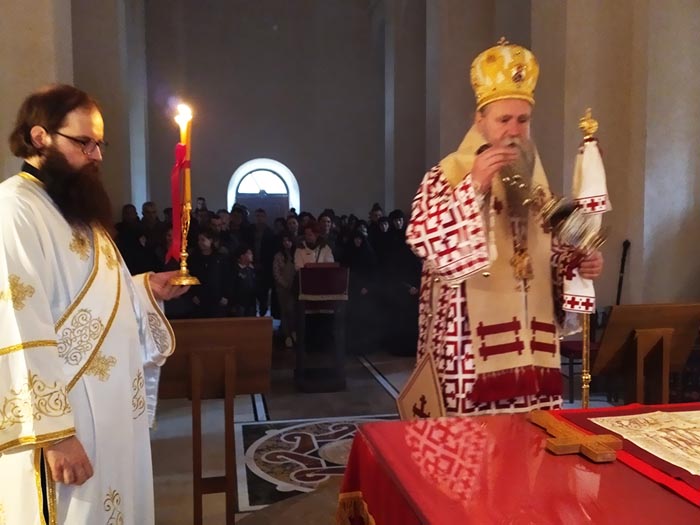 „Имамо велику радост да нам је, прве припремне недеље уочи Великог поста прије Васкрсења Христовог, недјељу о Закхеју, дошао наш драги Владика рашко-призренски косовско-метохијски Теодосије. Ми, када идемо на Косово и Метохију, у свету српску Земљу да посјетимо распети народ и распете светиње, отуда се, увијек, враћамо укријепљени од наших светиња и од љубави нашег распетог српског народа“.