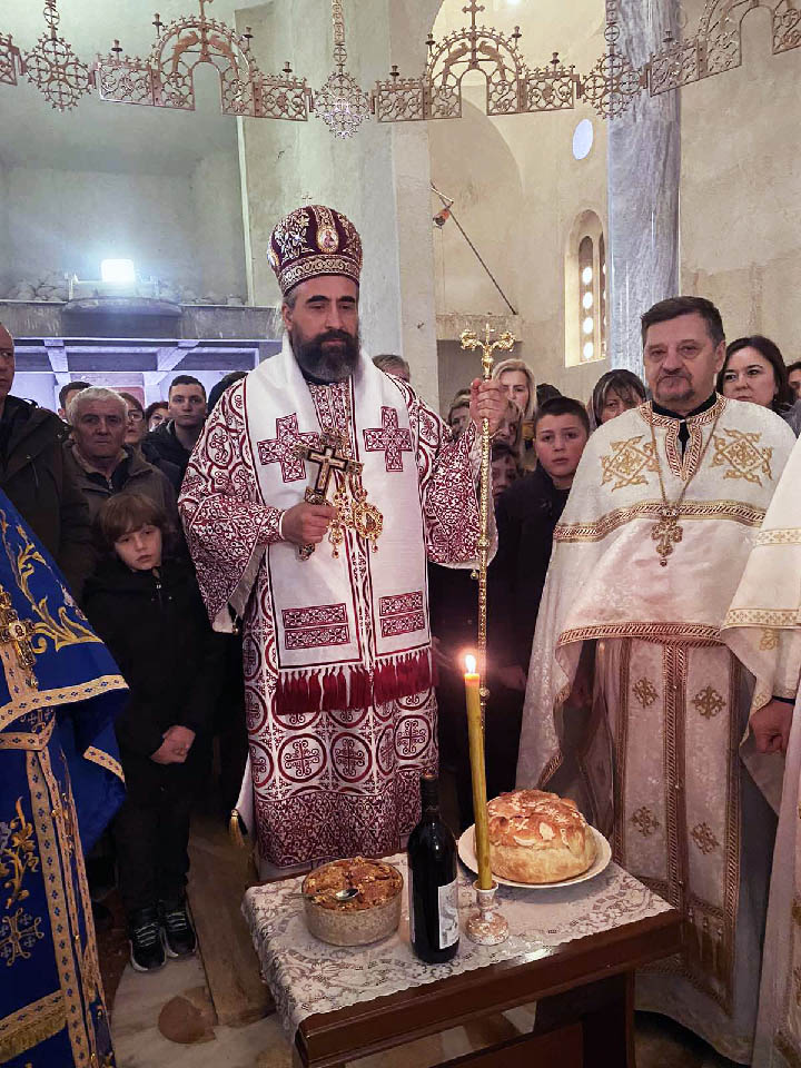 Послије заамвоне молитве, Владика је освештао и преломио славски колач поводом славе Саборног храма Светог Симеона Мироточивог, који се подиже у Беранама.