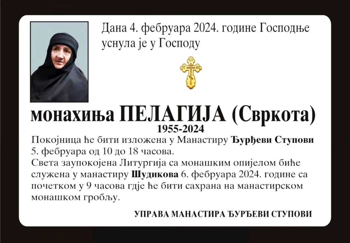 Дана 4. фебруара 2024. године Господње, уснула је у Господу монахиња Пелагија (Свркота).