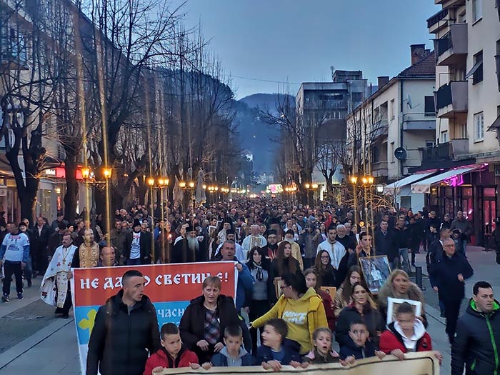 “Ми се боримо да очувамо наше светиње, имамо подршку од цијелог православља и од цијелог свијета који има савјести. Све више и западни свијет разумије да је овдје угрожена вјера и нико, ко има разума, не може подржати то да се било која вјера понижава, нарочито, не наша која је родила светитеље, изњедрила блиставу културу, створилиа наш идентитет и створила Црну Гору. Имамо подршку од Бога и од свих православних Цркава Божијих, а вечерас нам је, посебно, драго што је са нама Владика рашко-призренски Теодосије, који носи косовске ране на своме срцу и који нам је први дао подршку“.
