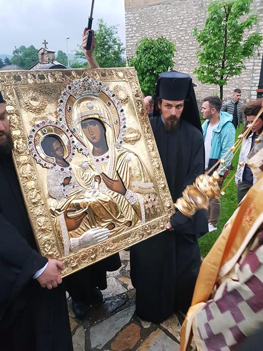 „То је, заиста, велики дар; он је то све финансирао, видите како је та лијепа светиња одмах украсила овај манастир, а мислим да је по Божјој вољи и правди да вечерас овдје, заједно са иконом и са нашим добротворима, дође и наш драги Игуман Хиландарски отац архимандрит Методије. Имамо, дакле, благослов на благослов, радост на радост. Преко Игумана манастира Хиландара и преко ове Чудотворне Иконе Мајке Божје, имамо хиландарски и светогорски благослов, а ако идемо даље и јерусалимски благослов, јер знамо да је икона Пресвете Богородице Тројеручице донијета из Палестине, из светог града Јерусалима, из манастира Светог Саве Освећеног“, указао је Његово Преосвештенство.