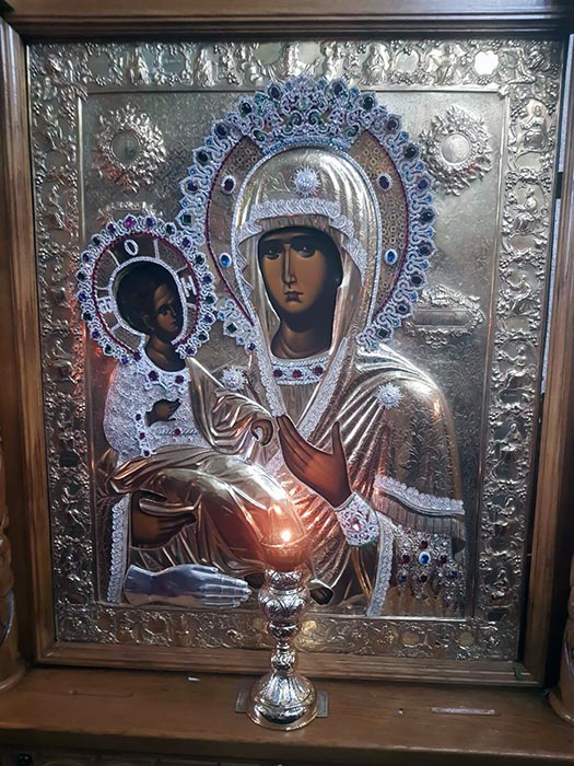 Преосвећени владика Лонгин је, овом приликом, дошао нарочитим поводом. Наиме, његов епархиот, г.-дин Милош Пантовић са својом супругом Достаном, је са великом љубављу манастиру Ђурђеви Ступови приложио диван дар, светињу која краси манастир Хиландар – икону Пресвете Богородице Тројеручице.