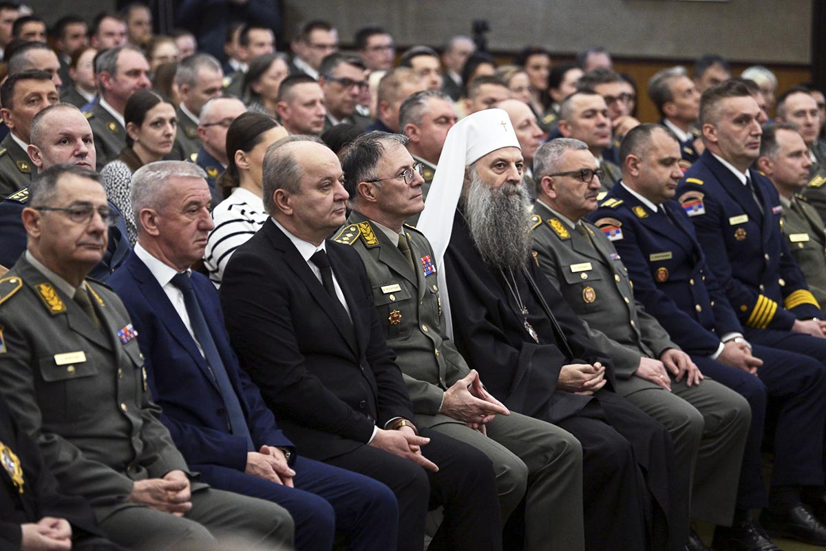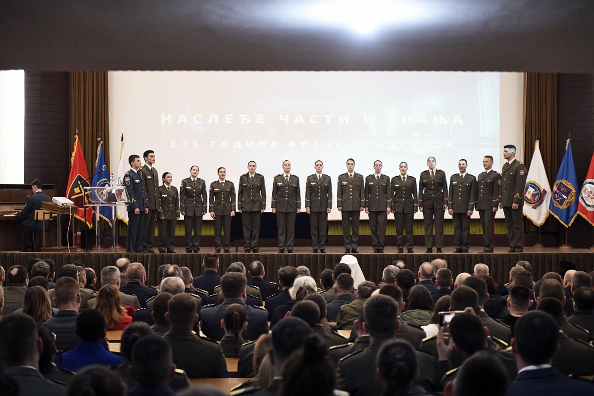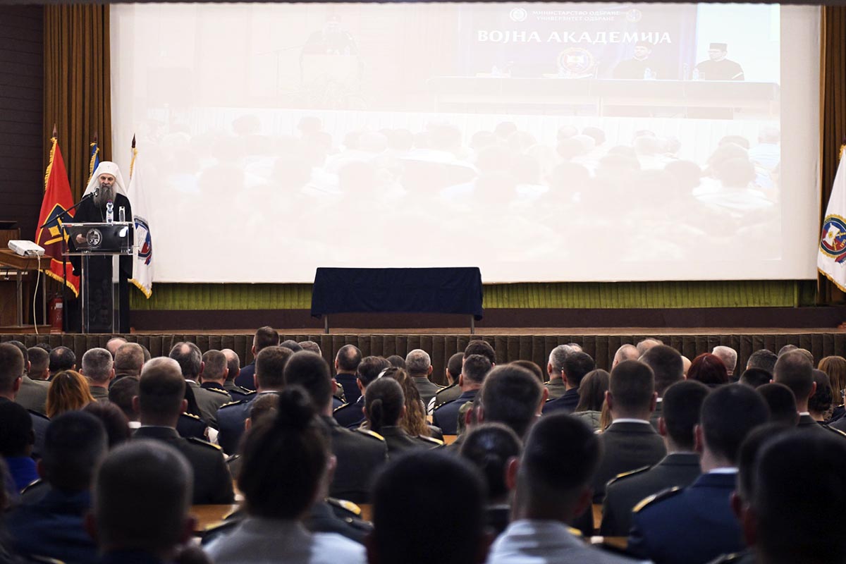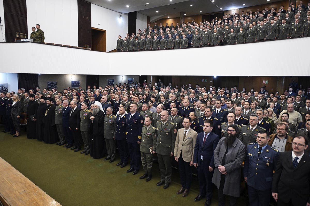 Посебно ме радује чињеница да, иако смо мала земља и малобројан народ, имамо Војну академију завидне традиције, која се најбоље огледа у кадру који је одшколовала и у оспособљености великана које је изнедрила. Њену славу, у срцима нашег народа и широм света, пронели су стратези антологијског калибра, који су због тога задобили заслужно место и у војним уџбеницима других народа и држава. Као просветна институција, Војна академија данас школује официре за 21. век, за мудро и етичко управљање применом силе. Стручњаке који теже остваривању виших циљева заснованих на војном +Кодексу части. Благословена је, међутим, околност да су новије генерације питомацâ, деца која су у основношколском систему образовања слушала веронауку, као и да неколико претходних класа, и ви данашњи кадети, заједно са наставним особљем и свим запосленима на Академији, имате могућност непосредног учешћа у практиковању вере, јер је враћањем верске службе у систем нашег Министарства одбране и Војску Србије и Војна академија добила свог свештеника. Зато је драгоцено имати у виду да, као верујући хришћани, наше животе и све у вези са њима, вреднујемо Јеванђељем Христовим и утемељујемо учешћем у светој Литургији и светим тајнама Цркве.