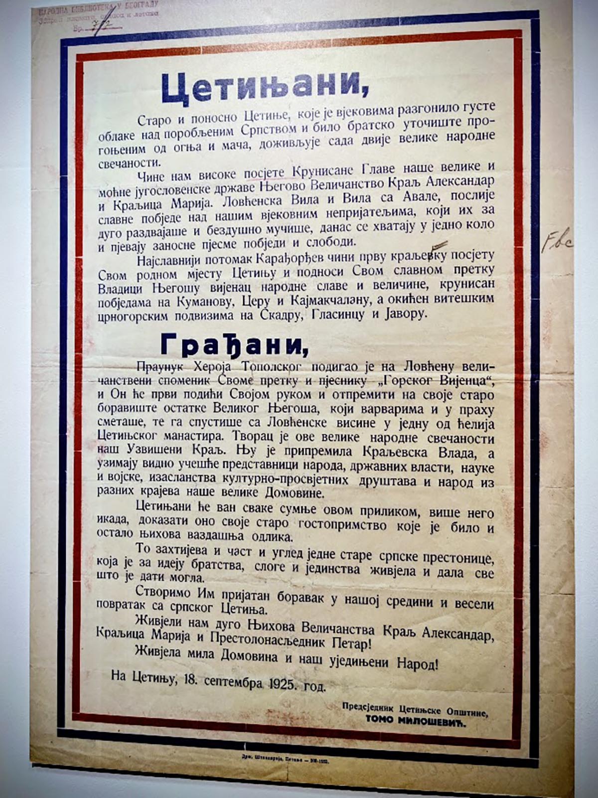 У оквиру програма обиљежавања 180 година од градње и 100 година од обнове Његошеве капеле на Ловћену, у организацији ЈУ Музеји и галерије Никшић, уприличена је и пројекција документарног филма „Свечана посјета краља Александра Првог Карађорђевића и краљице Марије Црној Гори и Далмацији 1925. године“ из фундуса Југословенске кинотеке у Београду.