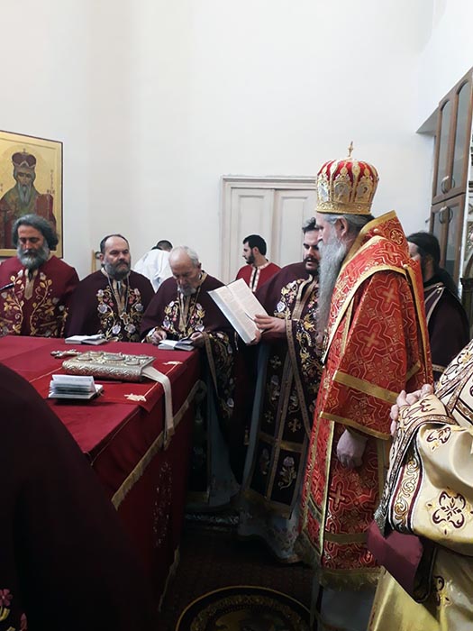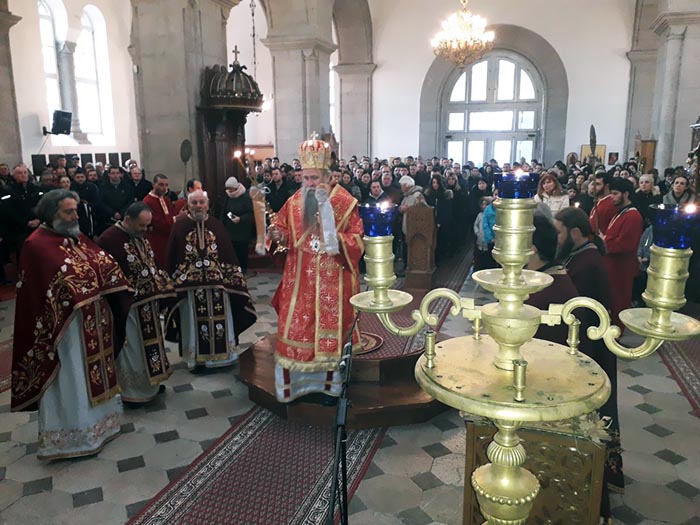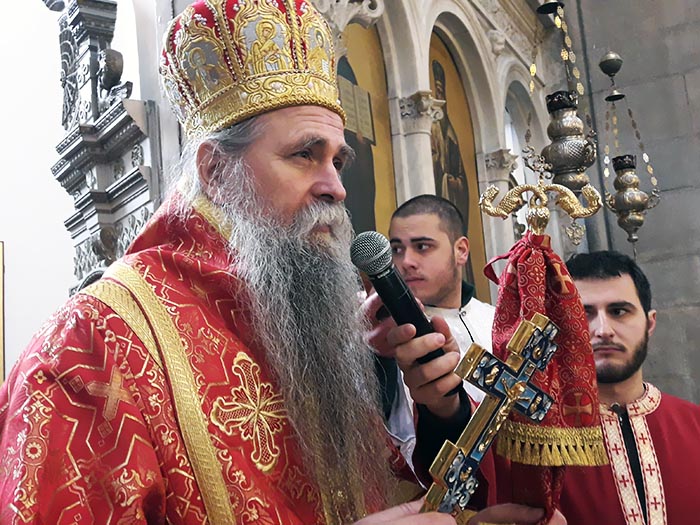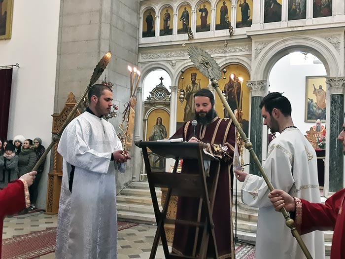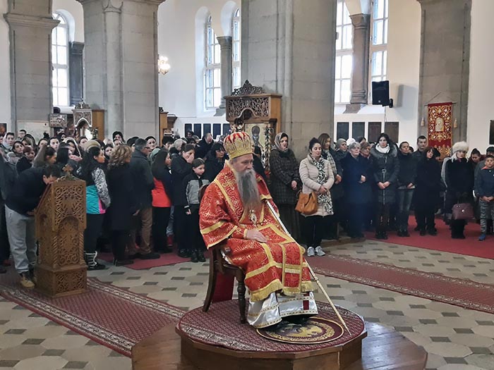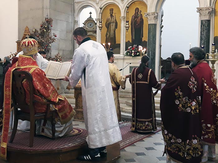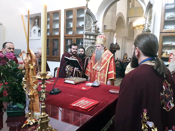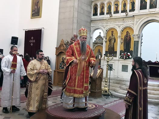 Његово Преосвештенство Епископ будимљанско-никшићки Г. Јоаникије служио је свету Литургију на Бадњи дан, у недјељу 6. јануара 2019, у Саборној цркви Светог Василија Острошког у Никшићу.