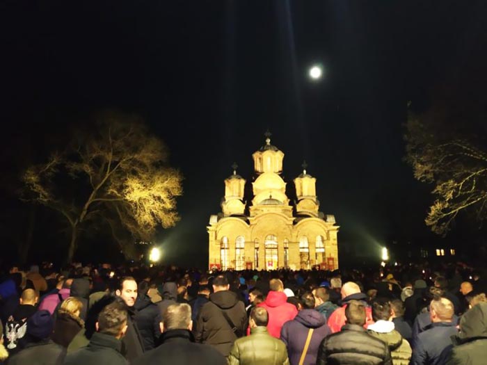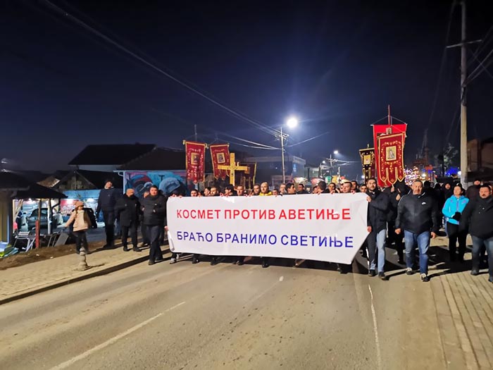 По хладном времену у Грачаници је вечерас шетало око 5.000 грађана у знак подршке народу који у Црној Гори већ данима протестује против закона о слободи вероисповести који је усвојила скупштина Црне Горе. На челу колоне која је кренула од Дома културе, окупљени су носили велики транспарент на коме пише – „Космет против аветиње, браћо бранимо светиње“. Они су се одатле упутили ка манастиру Грачаница где је Епископ рашко-призренски служио молебан за светиње у Црној Гори.