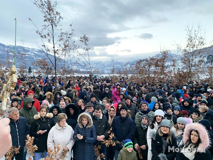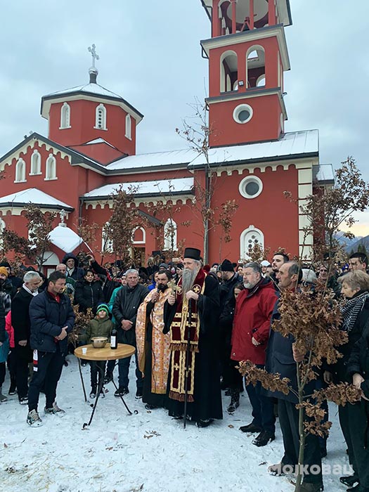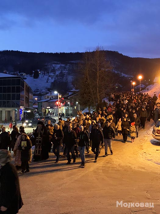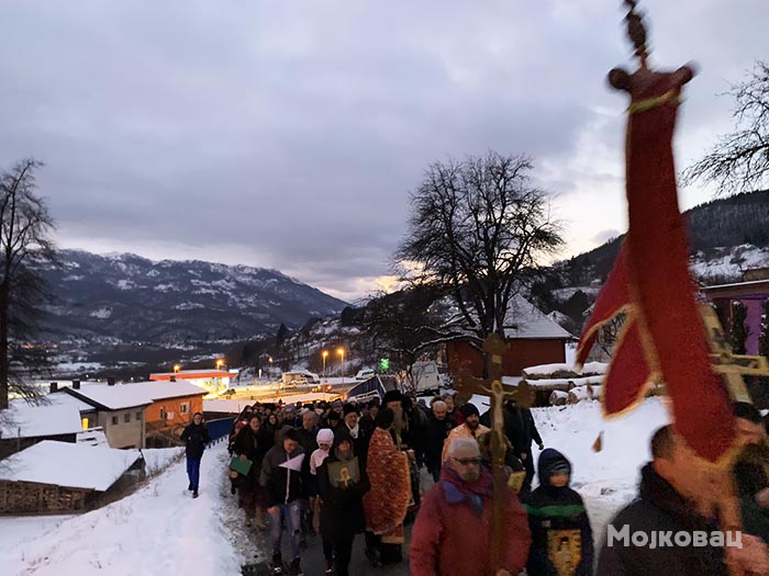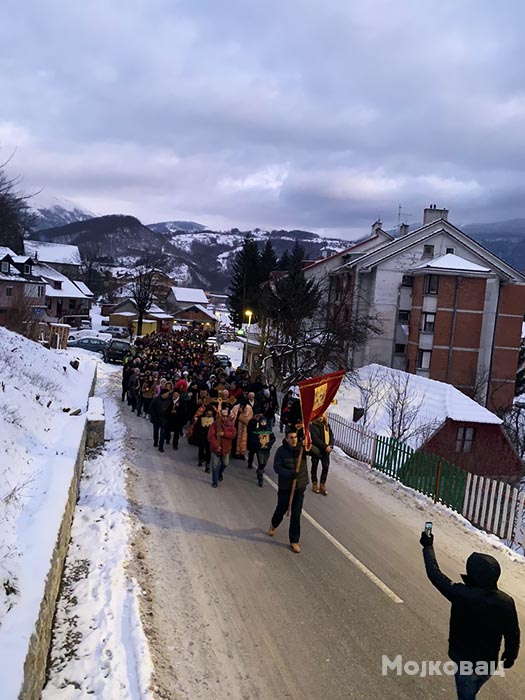 Потом је молитвена Литија вјерног народа, предвођења свештенством и Преосвећним владиком Јоаникијем, крсним ходом прошла кроз Мојковац, проносећи радост божићног празника и изражавјаући јавни протест и неслагање са неправдом, која се наноси Епархијама СПЦ у Црној Гори, њеним светињама и завештањима предака.