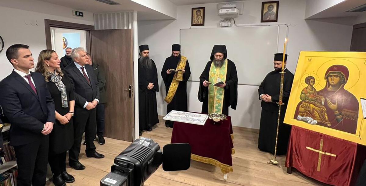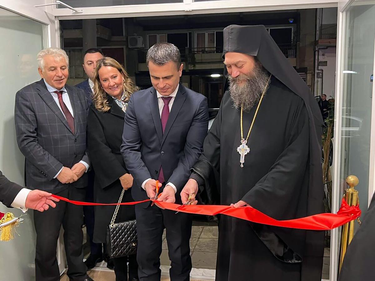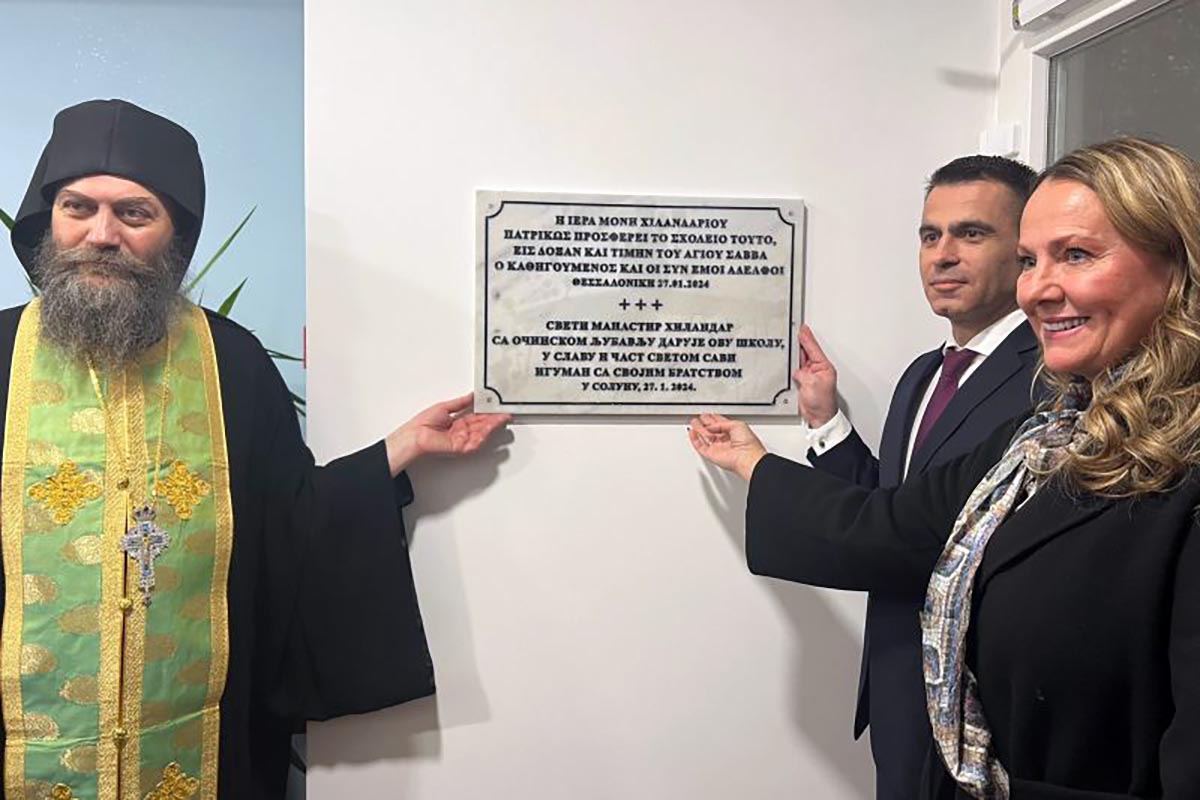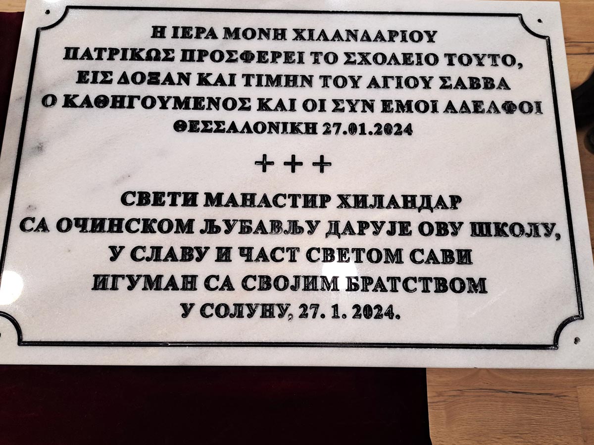 Врпцу су заједно пресекли игуман Методије и министар Милићевић. Откривена је табла на којој пише – Свети Манастир Хиландар са очинском љубављу дарује ову школу у славу и част Светом Сави. Игуман са својим братством у Солуну 27. 1. 2024.