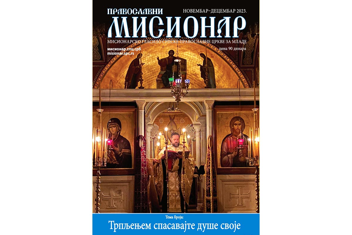 Пред читалачком публиком је нови 394. број „Православног мисионараˮ, званичног мисионарског гласила Српске Православне Цркве за младе. Тема наведеног броја носи наслов: „Трпљењем спасавајте душе својеˮ. Насловну страну краси светлопис са свеноћног бденија уочи празника Ваведења Пресвете Богородице у параклису Светог Јована Богослова на Православном богословском Факултету Универзитета у Београду.