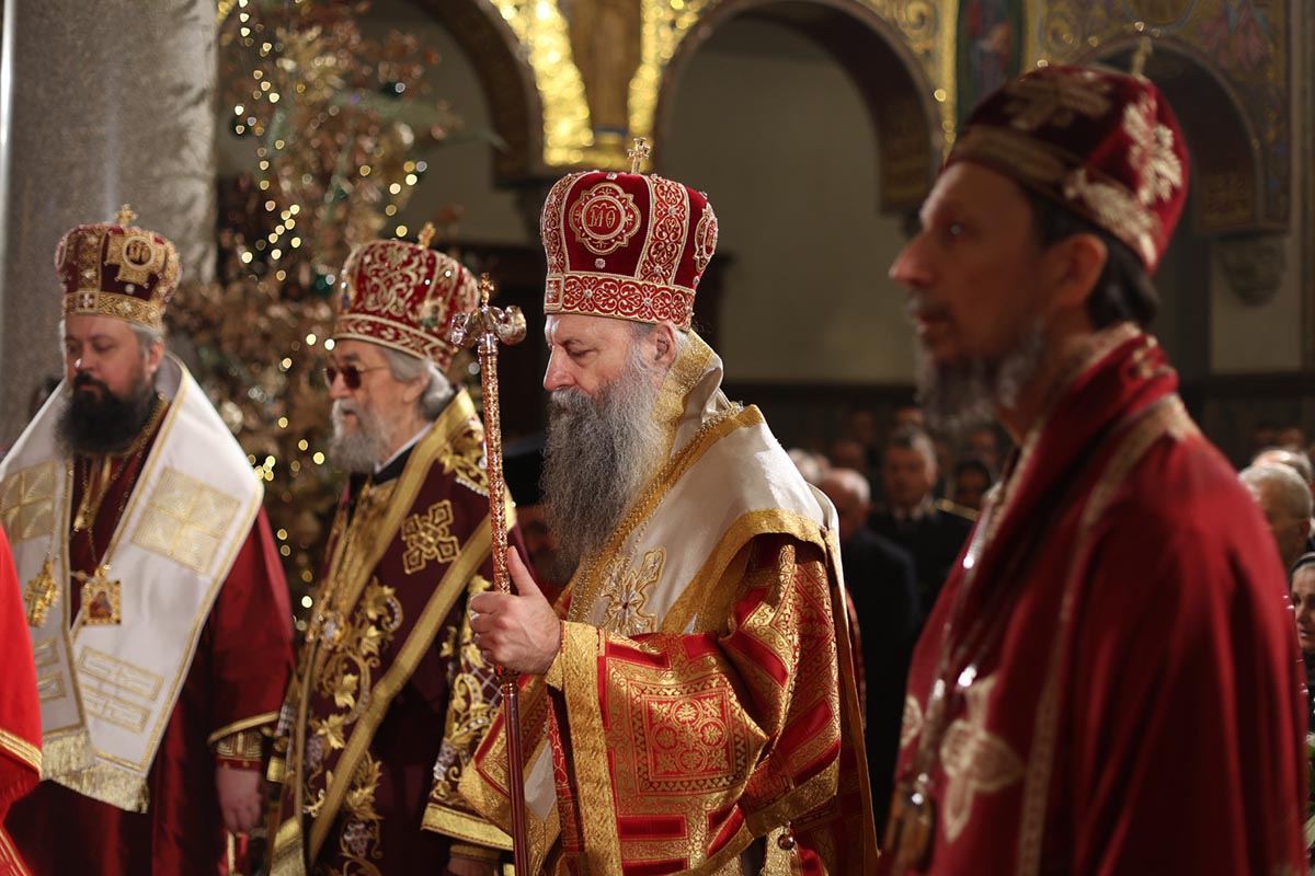 "Браћо и сестре, радосни и благословени смо што смо се данас сабрали на светој Литургији и што још увек у духовној радости славимо чудесно Рођење Сина Божјег од Духа Светог и Марије Дјеве. Славимо Сина Божјег који је постао човек ради нас и ради нашег спасења. Каква је то велика тајна и надумна љубав Божја да Бог постане један од нас, да оно што је неупоредиво више од нас, што не можемо умом појмити и чему не можемо приступити, постане наше и да оно што је неупоредиво мање од Бога Бог узме у своје наручје и учини га својим. У Христу Исусу, у Господу нашем, једанпут за свагда је успостављена нераскидива заједница између нас људи и Бога", беседио је Светејши Патријарх г. Порфирије и нагласио: