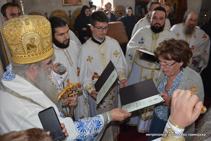 На крају Литургије Митрополит Амфилохије је на предлог предсједнице Кола српских сестара Црне Горе одликовао архијерејским похвалницама Бранку Војводић, Соњу Кривчевић, Мирјану Лалошевић и Зорицу Поповић.