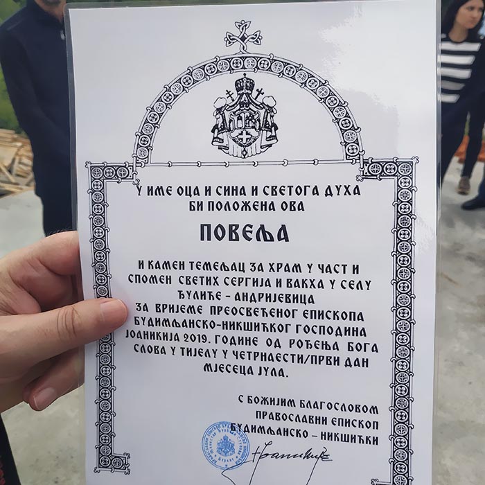 Његово Преосвештенство Епископ будимљанско-никшићки Г. Јоаникије освештао је, на празник Светих Козме и Дамјана, у недјељу 14. јула 2019, темеље цркве Светих Сергија и Ваха, која ће се градити у Ђулићима код Андријевице. Храм подиже г.-дин Зоран Ђерковић за покој душе брата Срђана.