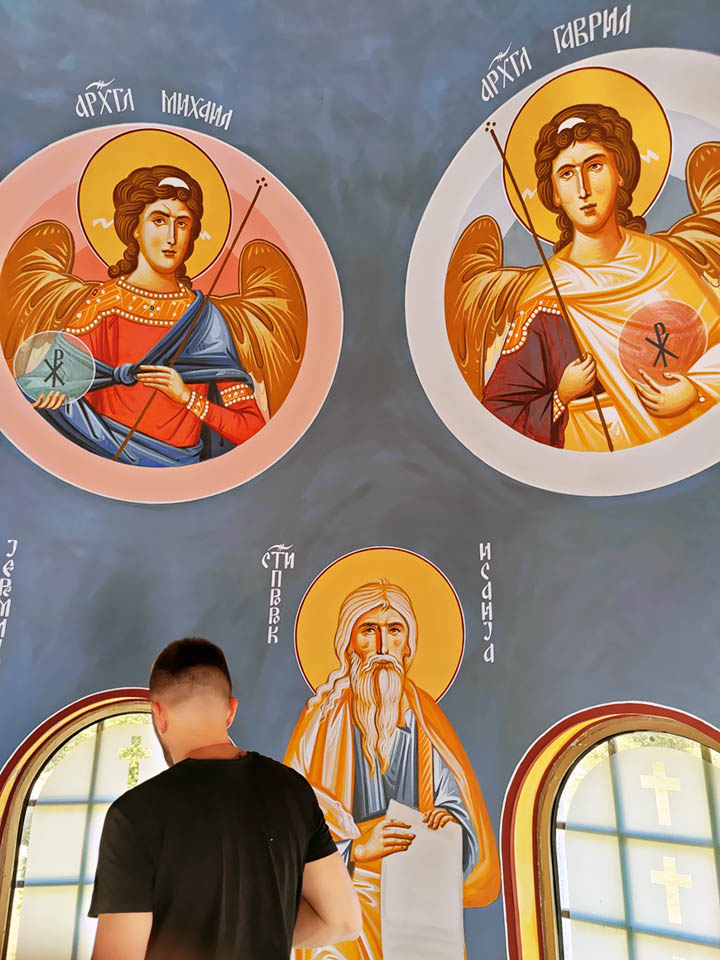 Преосвећени Епископ је са фрескописцем, Борисом Маркушем, који је ангажован на осликавању храма у Његњеву, разговарао о темпу рада, осликавању пандатифа и пијевница.
