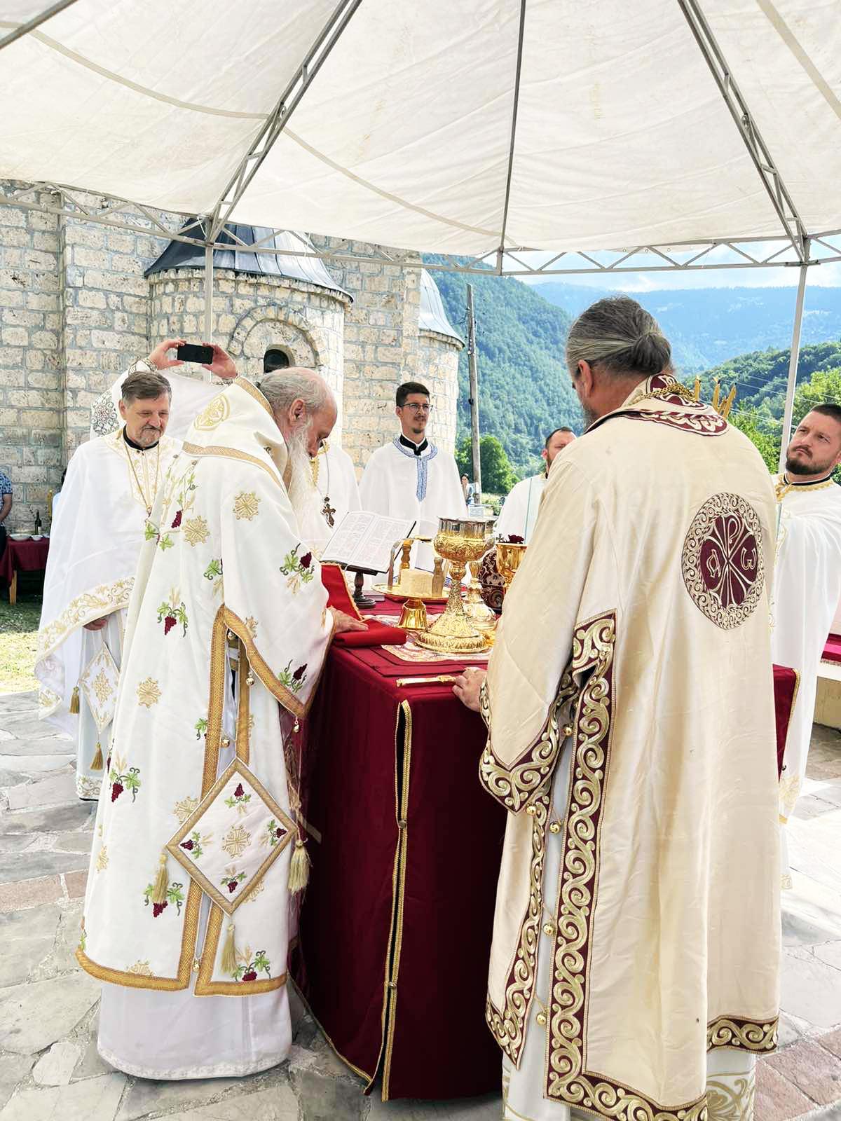 „Нека данашњи Велички, Горњеполимски и горњержанички мученици заједно са Пивским, Долским и свим мученицима, и Јасеновачким и свим српским мученицима и новомученицима да, молитвама њиховим, Господ да снаге и разума, покајања, благодати Божје да се сабирамо и да свако своје сабрање овако почињемо – молитвом, литургијом, да пришавши Богу љубави, на овом литургијском сабрању, никад не заборавимо наше и своје назначење које нам је Бог дао, да је Бог све из љубави своје створио, не да се мучимо и да овако ноге ломимо по својим јамама и рупама у које упадамо, и због својих грехова и укупно због грехова овога свијета и палог стања земље, која у злу лежи; да нас Господ учврсти, да се заједнички једни с другима сјединимо у љубави, праштању и милосрђу, јер не знам шта још треба да се догоди нашем народу што нам се већ није догодило, а да се призовемо у памет и да знамо да не постоји други пут и други начин, не постоји друго рјешење и избављење из гријеха, мука, патњи осим присаједињења са Господом“, бесједио је Његово Високопреосвештенство.