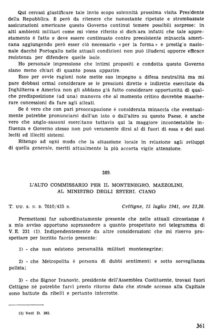 Одговор на то даје нам један важан документ, састављен три дана касније (Цетиње, 15. јули 1941. у 23,30 часова): извештај италијанског цивилног комесара Црне Горе Мацолинија (Mazzolini), послан у Рим, министру спољних послова Италије, грофу Ћану.