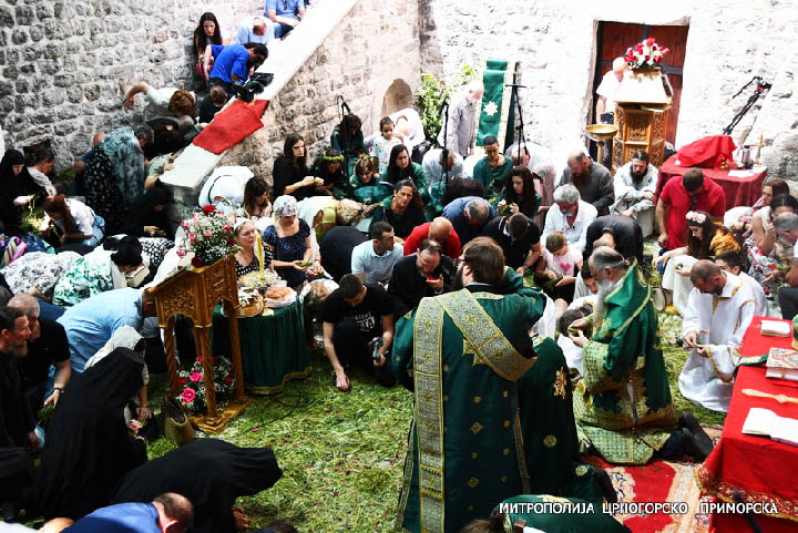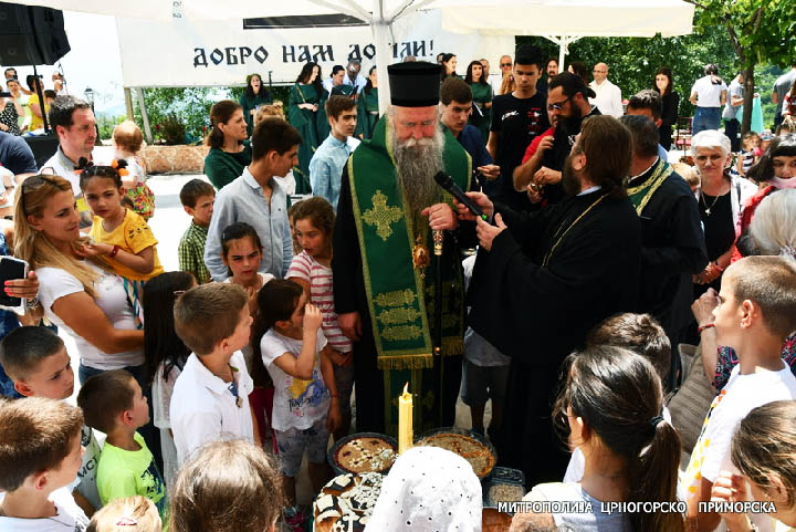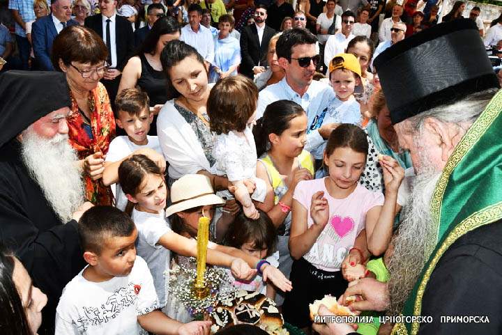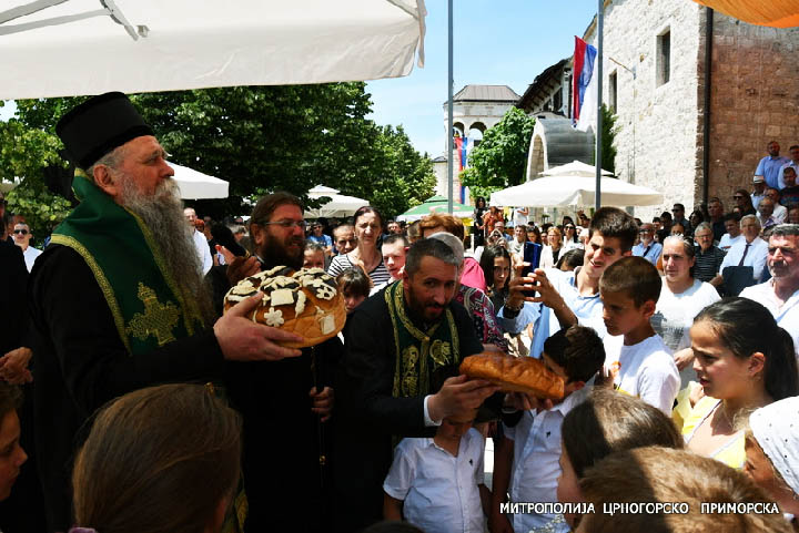 Након Свете службе Божије, на платоу испред храма, свечано је преломљен славски колач, а након благосиљања колача, изабрани Митрополит црногорско-приморски Јоаникије је још једном благословио и поздравио свечаре и драге госте, посебно обративши пажњу на дјецу која су са својим учитељима дошла из школе ”Први јун” из Подгорице, који славе Силазак Светога Духа и редовно долазе овдје на славу.