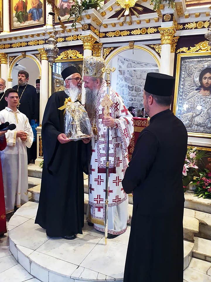 У име свештенства херцегновског и цијеле Боке, протојереј-ставрофор Радомир Никчевић, архијерејски намјесник херцегновски, заблагодарио је изабраном Митроплиту на доласку и принијетим молитвама за град и здравље његових житеља, за напредак и умножење свакога добра, и уручио скромни дар, дикирије и трикирије, симбол архијерејског служења.