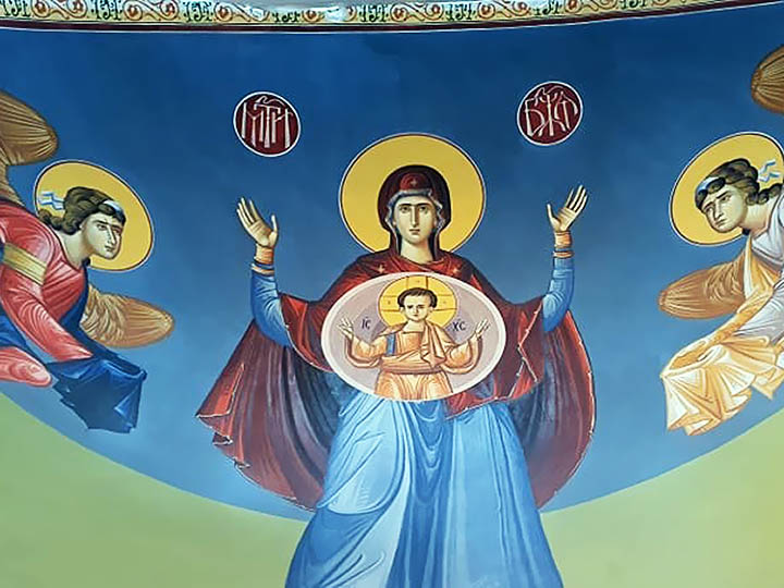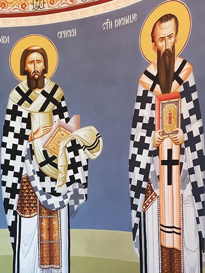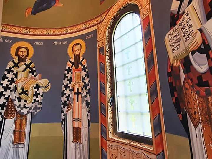Почетак живописања цркве кренуо је од олтарске апсиде, гдје су приказани Пресвета Богородица са Христом и анђели. У апсиди испод Пресвете Богородице насликани су Архијереји: Свети Василије Велики, Свети Јован Златоусти, Свети Григорије Богослов и Свети Сава Српски. У своду, који повезује проскомидију и ђаконик, насликан је Исус Христос "Старац Данима" са небеским силама, а у прочељу апсиде празник Педесетнице. Још треба да се заврши сцена Благовијести, Жртве Аврамове и Виђење Светог Петра Александријског, као и медаљони у луку и столпници на стубовима изнад иконостаса.
