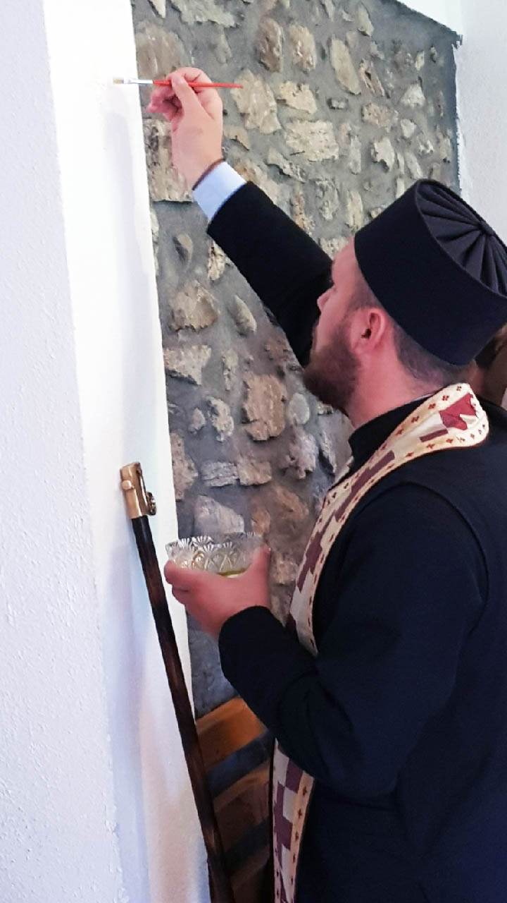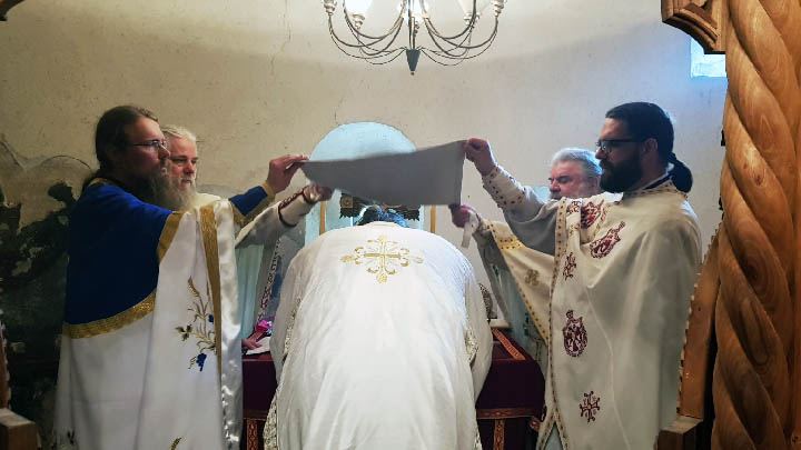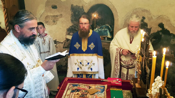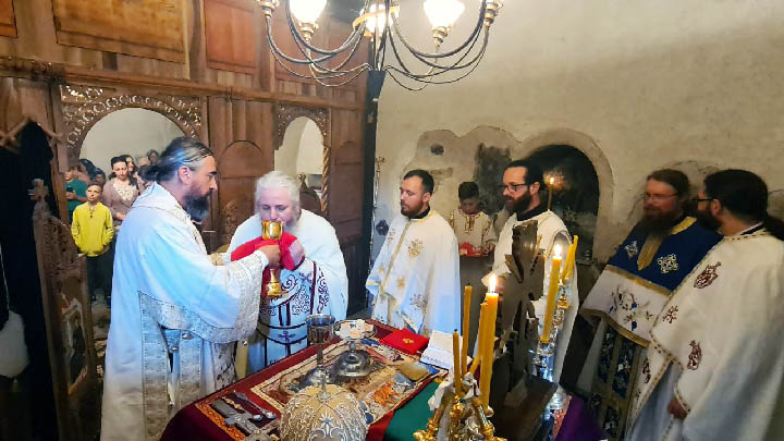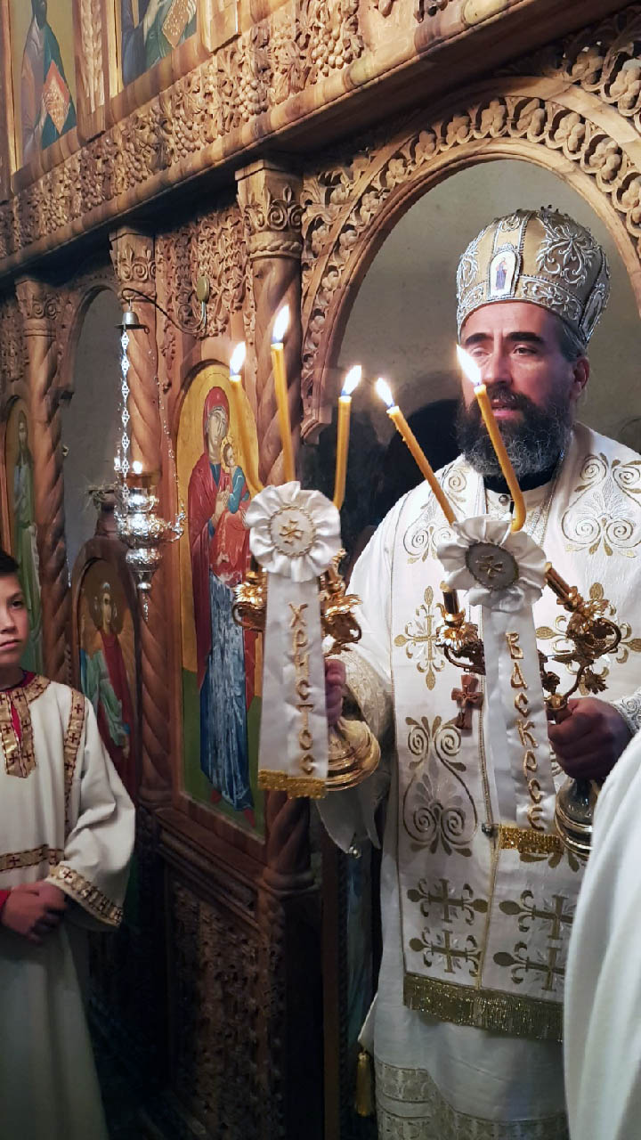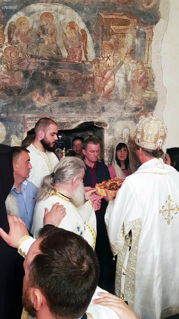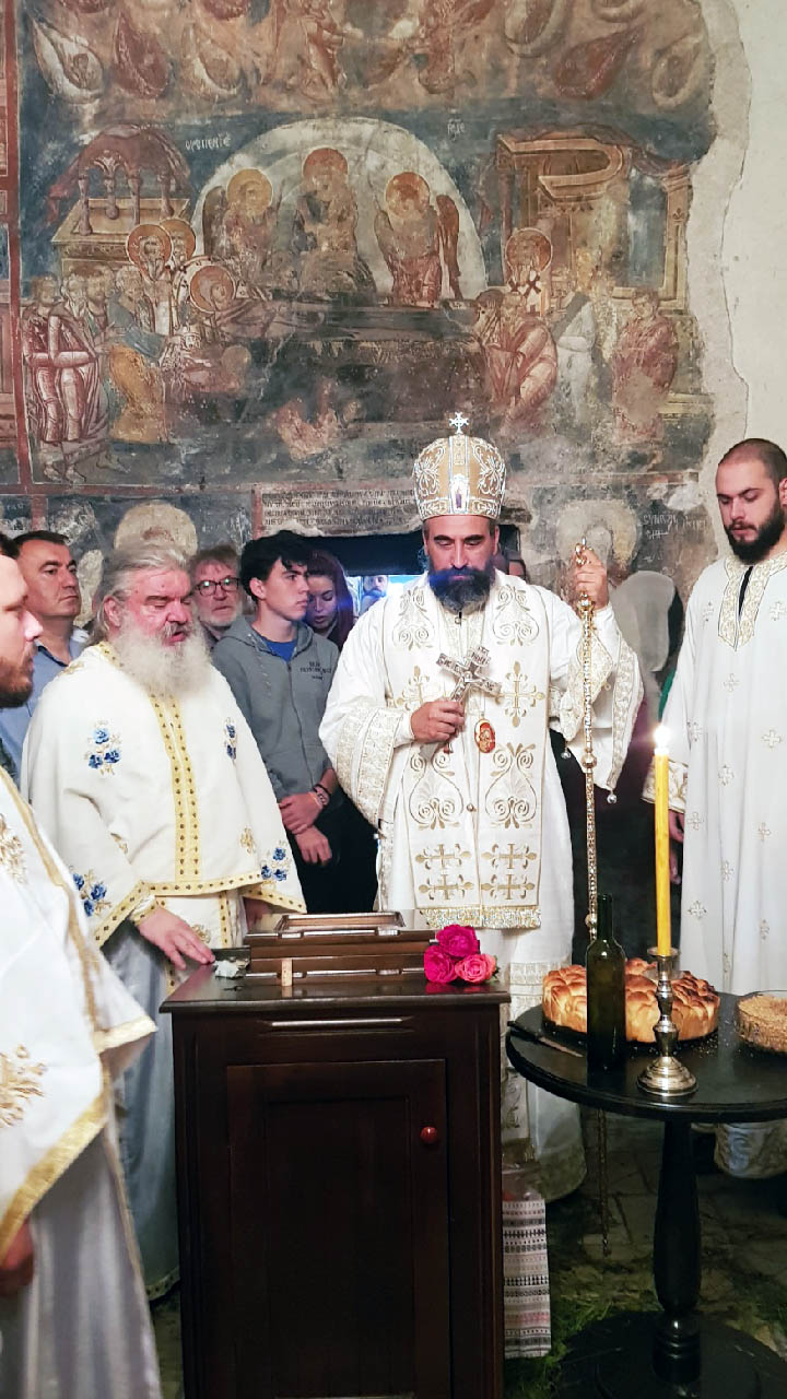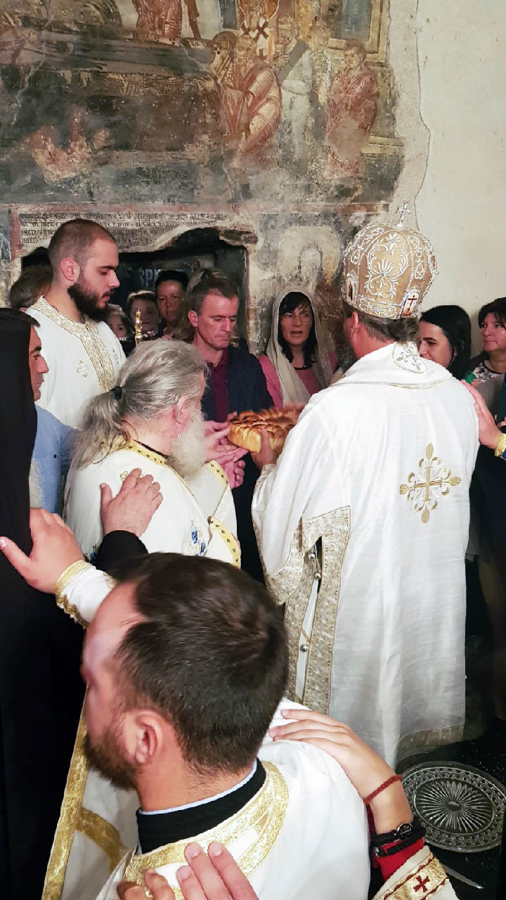 Након Литургије и причешћа вјерника, Преосвећени Владика је освештао и преломио славски колач и жито, честитајући сабранима велики празник, а игуману ове свете обитељи, јеромонаху Георгију, храмовну славу.