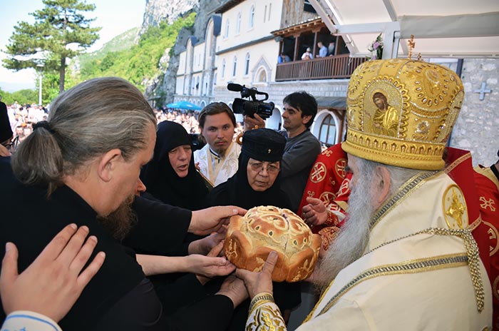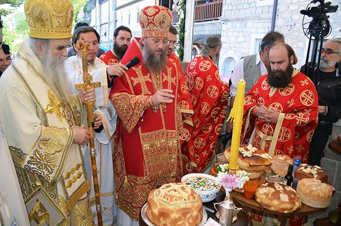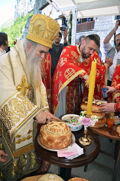 Потом је Митрополит Амфилохије са саслужитељима благосиљао и пререзао славски колач који је у славу Божију, а у част Светог Василија Острошког припремила острошка братија, као и славске колаче бројних свечара.