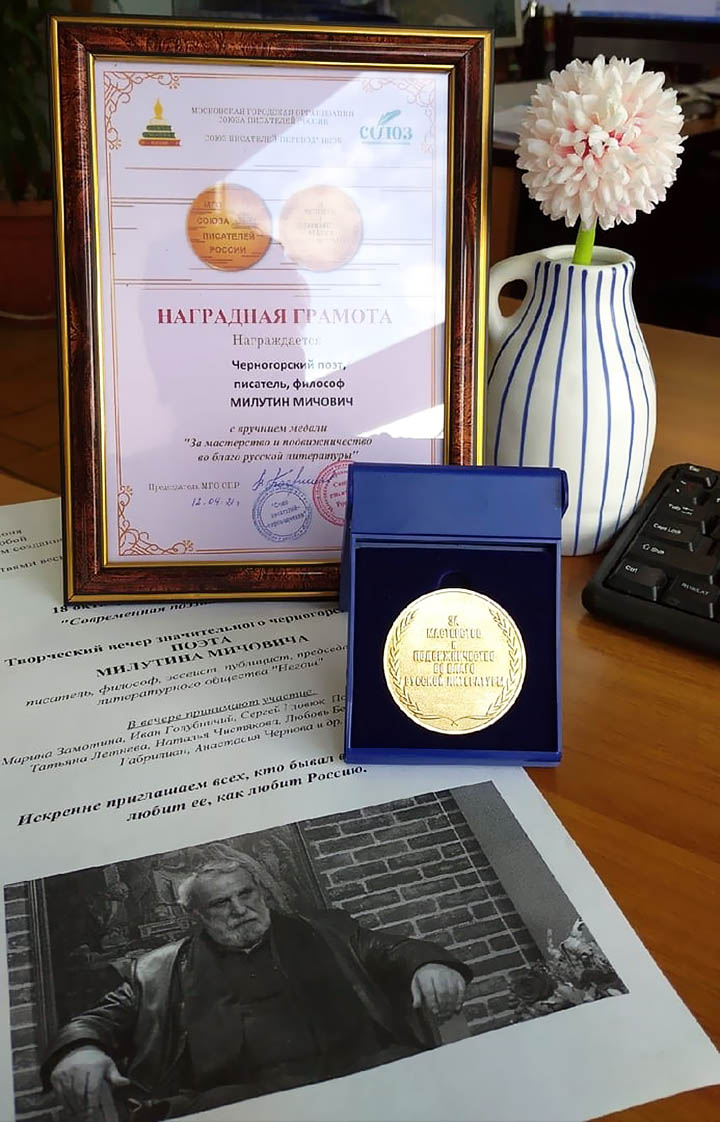 Ових дана је Савез писаца Русије додијелио високо књижевно признање – Медаљу за мајсторство и подвижништво на добро руске литературе (Медаль за мастерство и подвижничество во благо русской литературы), књижевнику и предсједнику Књижевног друштва „Његош“, Милутину Мићовићу