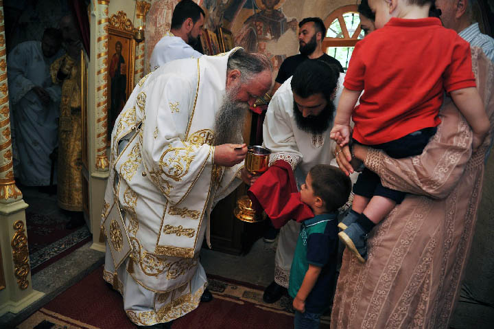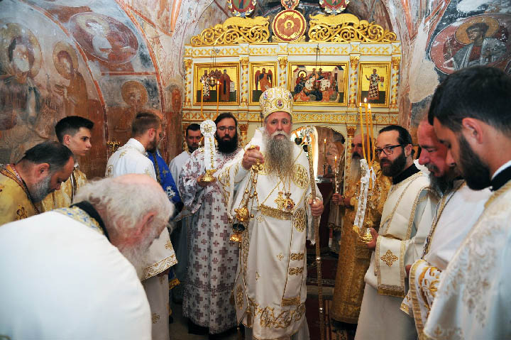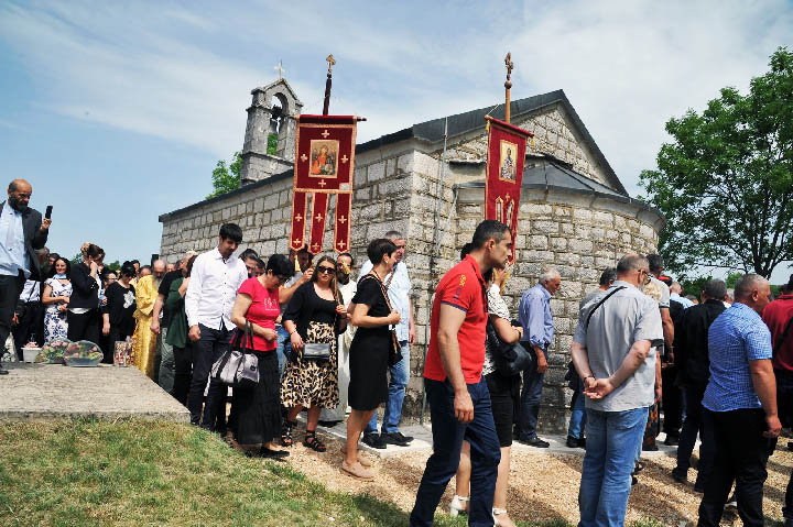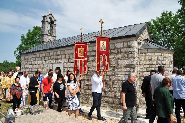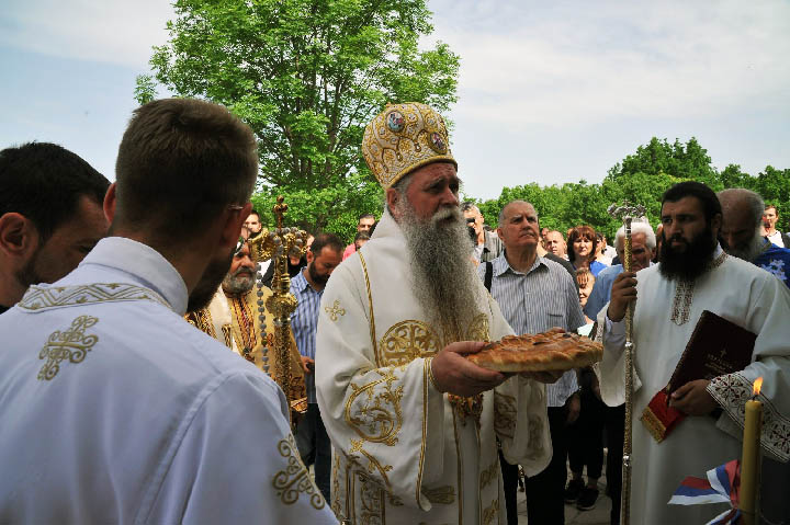По одслуженој Литургији и причешћа вјерника, литија вјерног народа је опходила храм, а освештан је и преломљен славски колач и жито. Владика Методије је ријечима добродошлице поздравио Високопреосвећеног Митрополита Јоаникија, захваливши му што је дошао у свој родни крај.