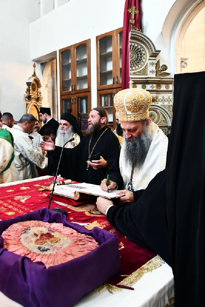 “Ваша Светости и браћо архијереји, са љубављу и радошћу вас данас срећемо, торжественим славословљем вас дочекујемо и свима вам желимо снагу и сваку помоћ од Господа у добрим дјелима и почецима. Добродошли у ове свете дворе славе Божје, свете дворе славнога рода нашега. Ваша Светости, молим вас да нас, нашу земљу и сав народ наш благословите светим патријарашким благословом и нека Господ и Свети Сава и Свети Василије руководе вашим архипастирским радом и вашим животом у у цјелини. На многаја љета!”