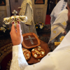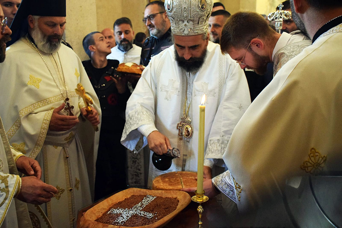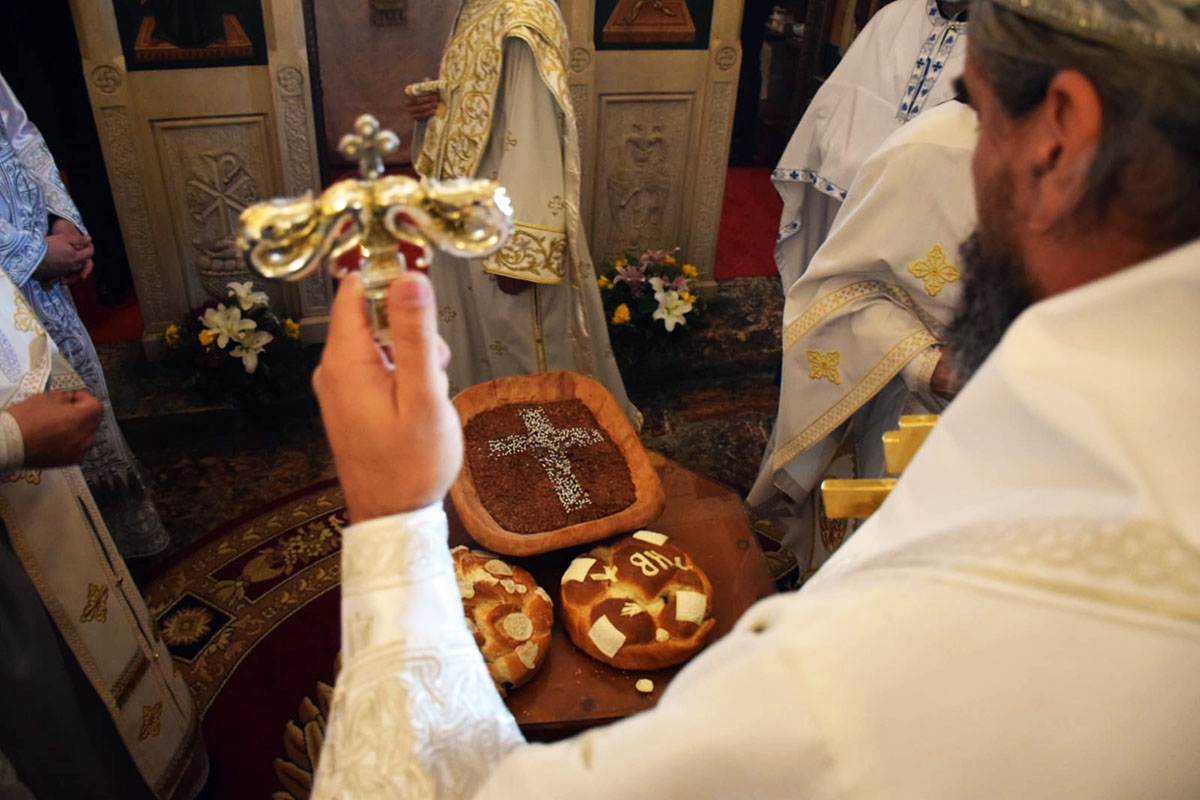 Освештан је и преломљен славски колач и жито.