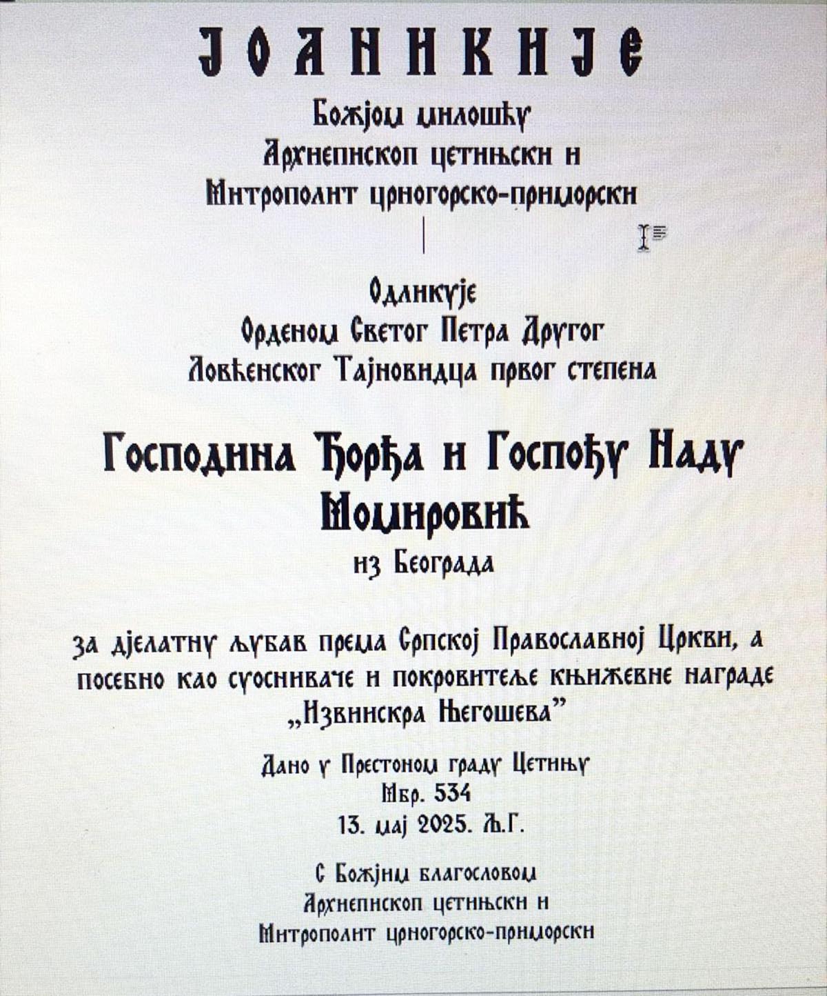 Његово Високопреосвештенство Архиепископ цетињски и Митрополит црногорско-приморски господин Јоаникије одликовао је 17. маја 2025. године господина Ђорђа и госпођу Наду Момировић из Београда Орденом Светог Петра Другог Ловћенског Тајновидца првог степена за дугогодишњу дјелатну љубав према Српској Православној Цркви, а посебно као суосниваче и покровитеље књижевне награде ”Извиискра Његошева”.